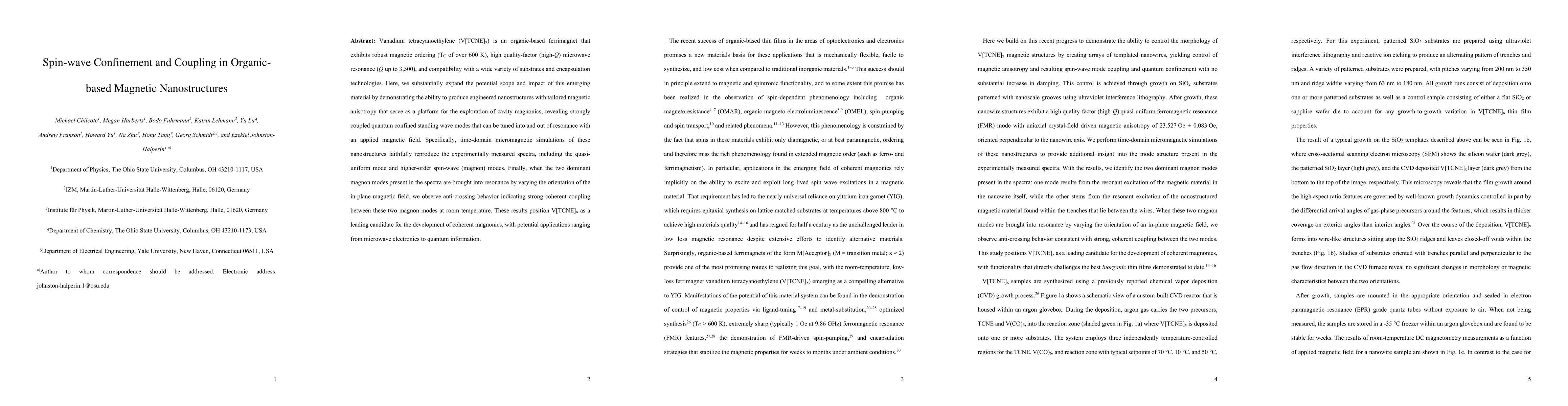 This paper demonstrates the fabrication of engineered nanostructures from vanadium tetracyanoethylene (V[TCNE]$_\text{x}$), an organic-based ferrimagnet, showcasing strong spin-wave confinement and coupling. The study reveals tunable quantum confined spin-wave modes and strong coherent coupling between dominant magnon modes at room temperature, positioning V[TCNE]$_\text{x}$ as a promising material for coherent magnonics and potential applications in microwave electronics and quantum information.