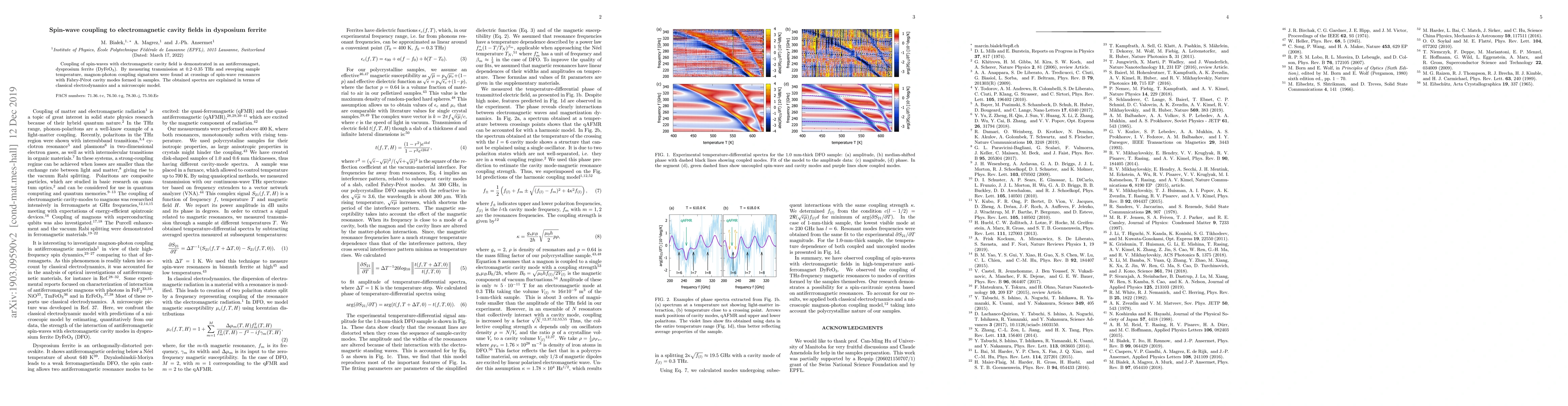 This paper demonstrates spin-wave coupling with electromagnetic cavity fields in dysprosium ferrite (DyFeO3), revealing magnon-photon coupling signatures at spin-wave resonance crossings with cavity modes in the 0.2-0.35 THz range, supported by classical electrodynamics and a microscopic model.