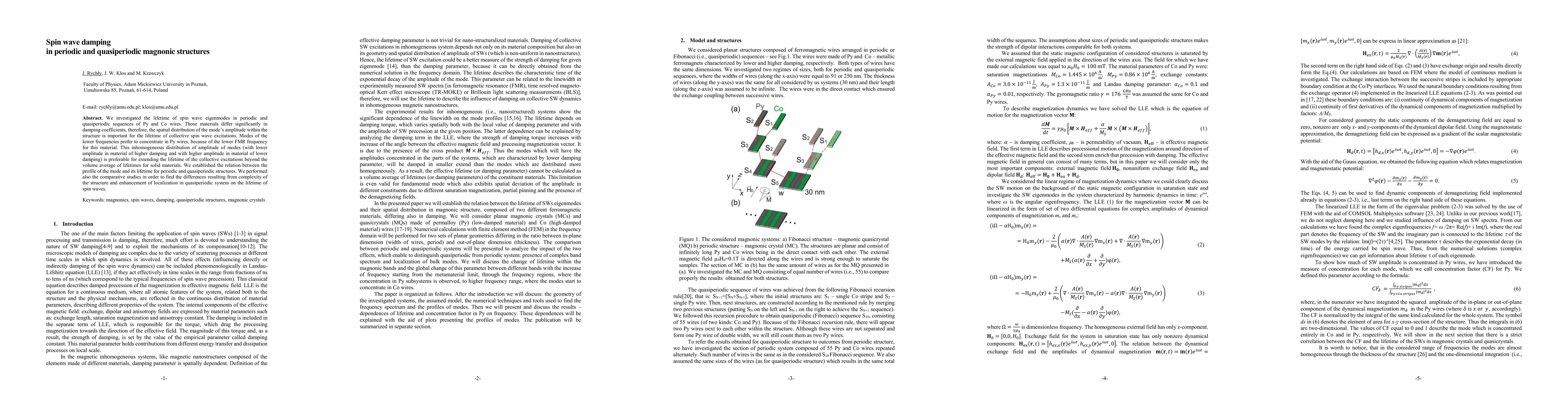 This study investigates the spin wave damping in periodic and quasiperiodic sequences of Py and Co wires, finding that lower frequency modes concentrate in Py due to its lower FMR frequency. The inhomogeneous amplitude distribution, with higher amplitude in lower damping materials, extends the lifetime of spin wave excitations beyond average values.
