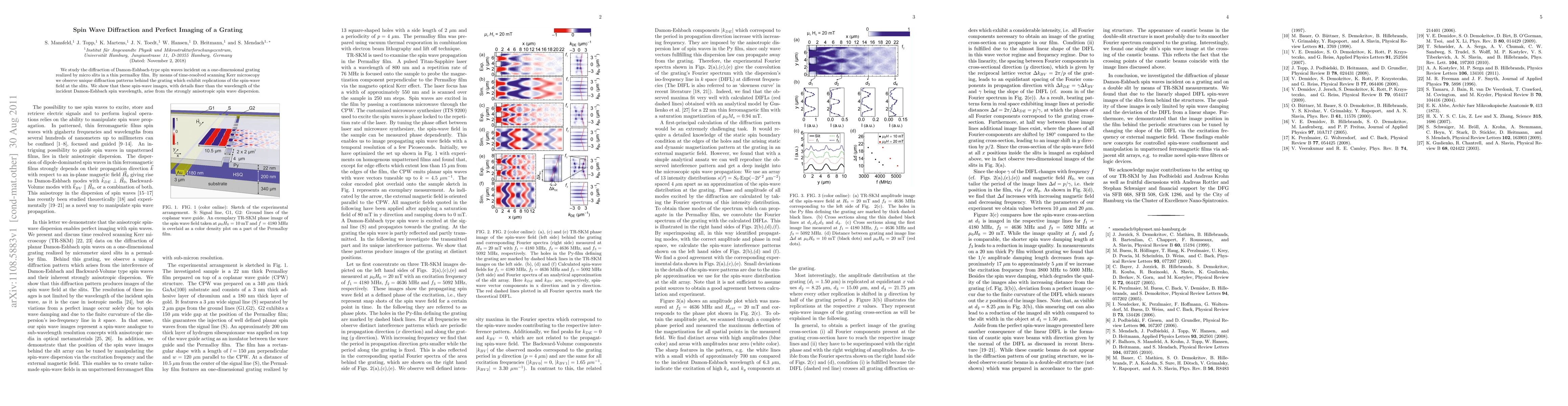 We study the diffraction of Damon-Eshbach-type spin waves incident on a one-dimensional grating realized by micro slits in a thin permalloy film. By means of time-resolved scanning Kerr microscopy we observe unique diffraction patterns behind the grating which exhibit replications of the spin-wave field at the slits. We show that these spin-wave images, with details finer than the wavelength of the incident Damon-Eshbach spin wavelength, arise from the strongly anisotropic spin wave dispersion.