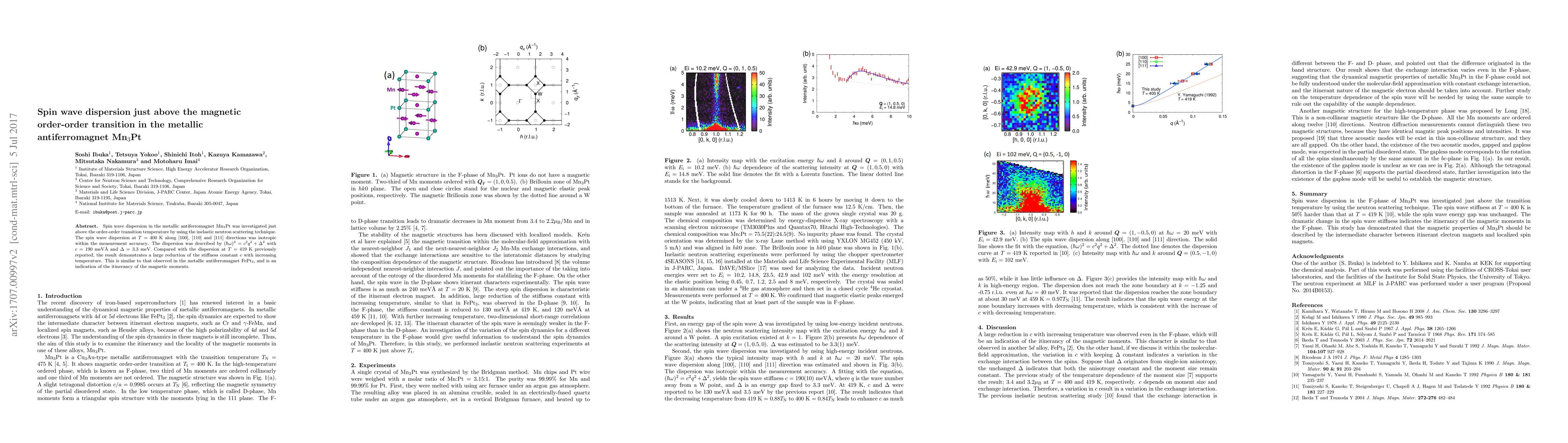 Spin wave dispersion in the metallic antiferromagnet Mn$_3$Pt was investigated just above the order-order transition temperature by using the inelastic neutron scattering technique. The spin wave dispersion at $T = 400$ K along [100], [110] and [111] directions was isotropic within the measurement accuracy. The dispersion was described by $({\hbar\omega})^2 = c^2q^2 + \Delta^2$ with $c = 190$ meV {\AA} and $\Delta = 3.3$ meV. Compared with the dispersion at $T = 419$ K previously reported, the result demonstrates a large reduction of the stiffness constant $c$ with increasing temperature. This is similar to that observed in the metallic antiferromagnet FePt$_3$, and is an indication of the itinerancy of the magnetic moments.