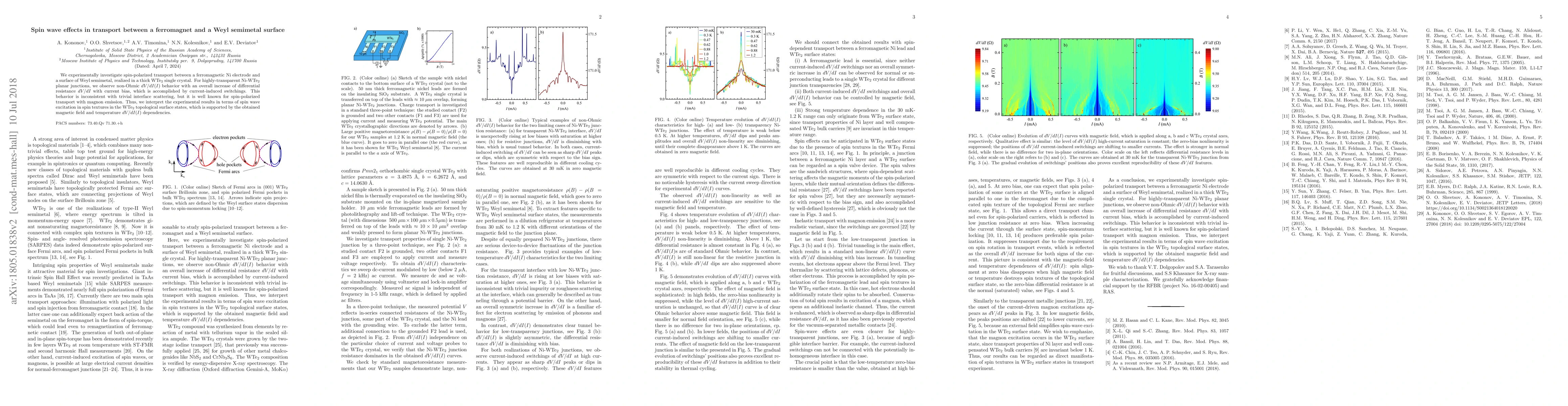 This paper investigates spin-polarized transport between a ferromagnetic Ni electrode and a Weyl semimetal WTe$_2$, revealing non-Ohmic behavior due to spin wave excitations in the WTe$_2$ surface states, as evidenced by current-induced switchings and dependencies on magnetic field and temperature.