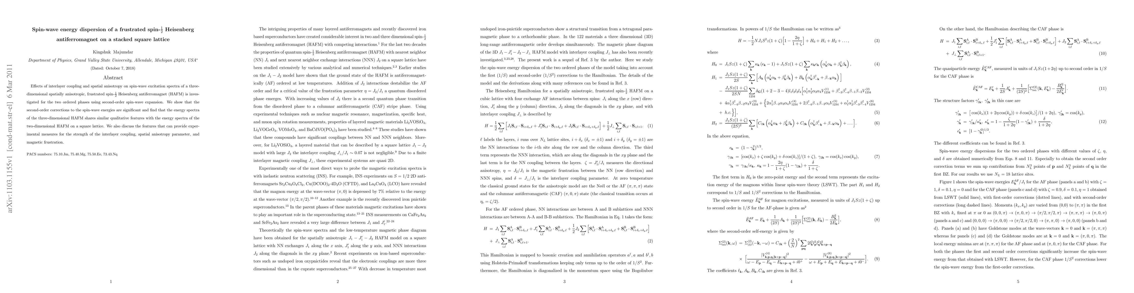 This paper investigates the spin-wave energy dispersion in a frustrated spin-1/2 Heisenberg antiferromagnet on a stacked square lattice, revealing significant second-order corrections and similarities between three-dimensional and two-dimensional spin-wave spectra. It also identifies experimental measures for interlayer coupling, spatial anisotropy, and magnetic frustration.