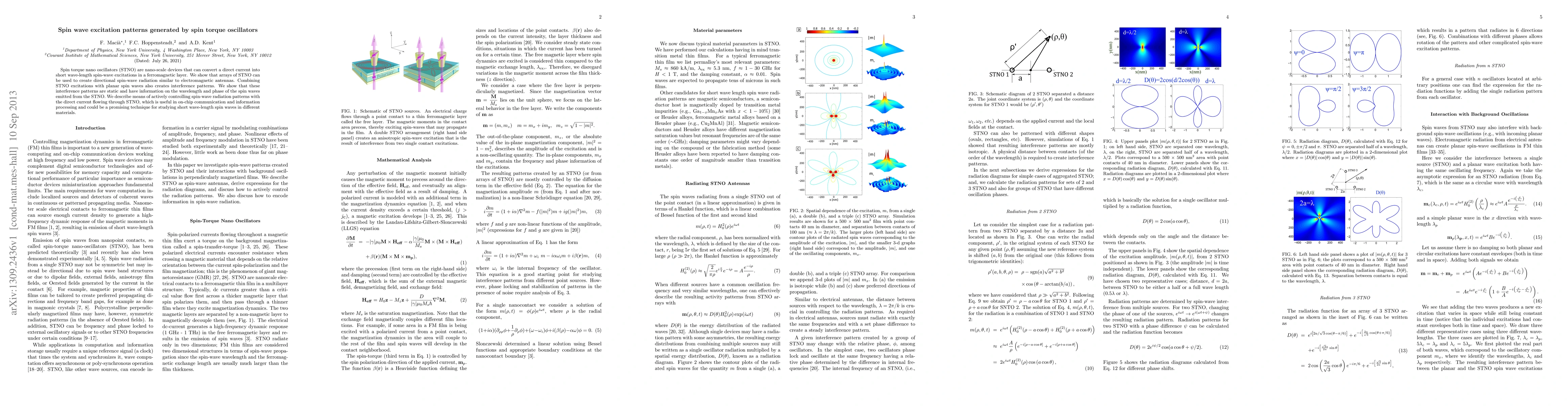 Spin torque nano oscillators (STNO) are nano-scale devices that can convert a direct current into short wave-length spin-wave excitations in a ferromagnetic layer. We show that arrays of STNO can be used to create directional spin-wave radiation similar to electromagnetic antennas. Combining STNO excitations with planar spin waves also creates interference patterns. We show that these interference patterns are static and have information on the wavelength and phase of the spin waves emitted from the STNO.We describe means of actively controlling spin-wave radiation patterns with the direct current owing through STNO, which is useful in on-chip communication and information processing and could be a promising technique for studying short wave-length spin waves in different materials.