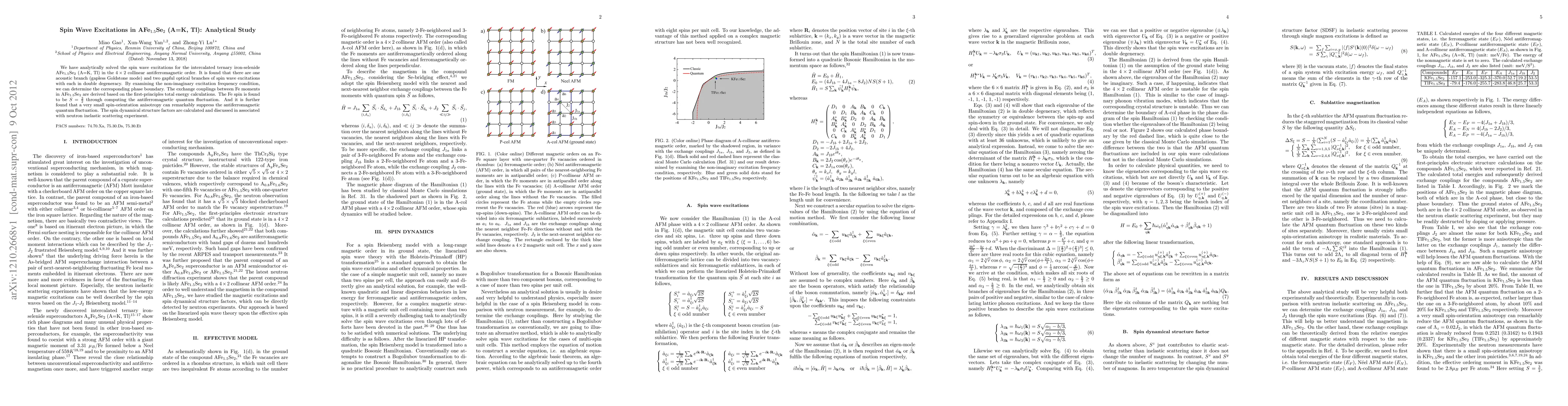 This study analytically solves spin wave excitations in AFe1.5Se2 (A=K, Tl), revealing one gapless mode and two double-degenerate gapful modes. It derives exchange couplings via first-principles calculations, finds Fe spin as S=3/2, and shows that minor spin-orientation anisotropy can significantly reduce antiferromagnetic quantum fluctuation. The research also calculates spin dynamical structure factors for comparison with neutron scattering experiments.