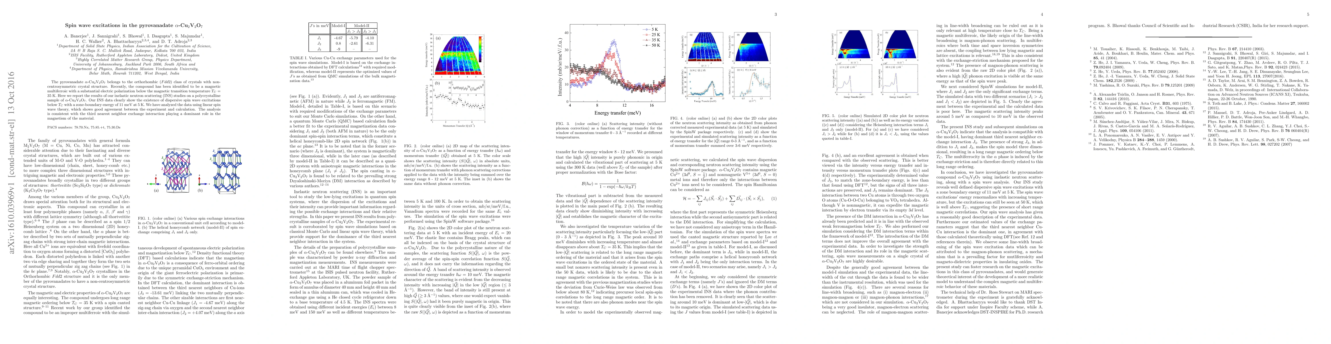 The pyrovanadate alpha-Cu2V2O7 belongs to the orthorhombic (Fdd2) class of crystals with noncentrosymmetric crystal structure. Recently, the compound has been identified to be a magnetic multiferroic with a substantial electric polarization below the magnetic transition temperature TC = 35 K. Here we report the results of our inelastic neutron scattering (INS) studies on a polycrystalline sample of alpha-Cu2V2O7. Our INS data clearly show the existence of dispersive spin wave excitations below TC with a zone-boundary energy of 11 meV at 5 K.We have analyzed the data using linear spin wave theory, which shows good agreement between the experiment and calculation. The analysis is consistent with the third nearest neighbor exchange interaction playing a dominant role in the magnetism of the material.