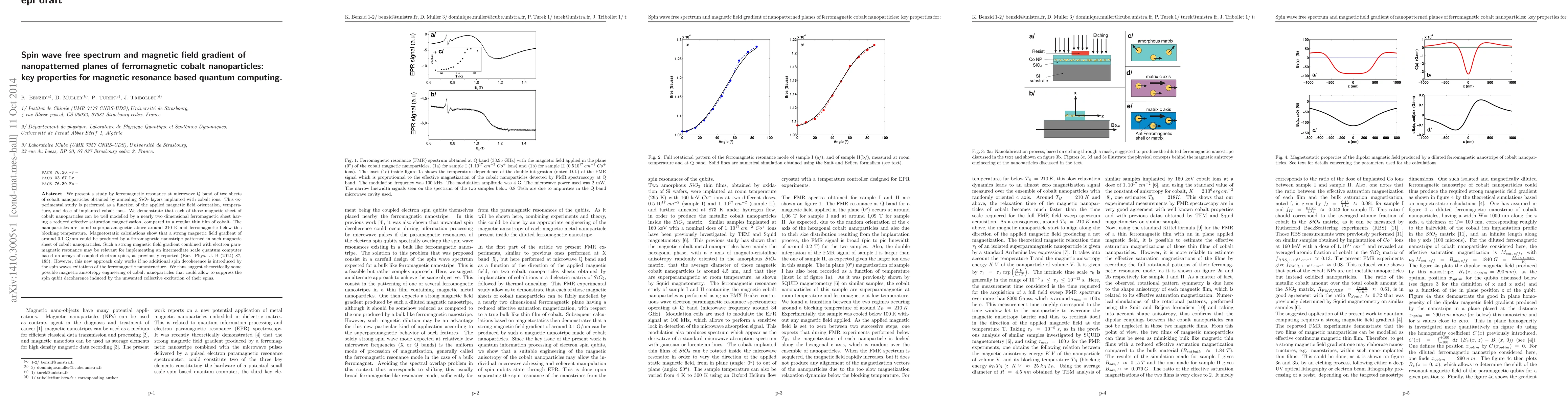 We present a study by ferromagnetic resonance at microwave Q band of two sheets of cobalt nanoparticles obtained by annealing SiO2 layers implanted with cobalt ions. This ex- perimental study is performed as a function of the applied magnetic field orientation, tempera- ture, and dose of implanted cobalt ions. We demonstrate that each of those magnetic sheet of cobalt nanoparticles can be well modelled by a nearly two dimensional ferromagnetic sheet hav- ing a reduced effective saturation magnetization, compared to a regular thin film of cobalt. The nanoparticles are found superparamagnetic above around 210 K and ferromagnetic below this blocking temperature. Magnetostatic calculations show that a strong magnetic field gradient of around 0.1 G/nm could be produced by a ferromagnetic nanostripe patterned in such magnetic sheet of cobalt nanoparticles. Such a strong magnetic field gradient combined with electron para- magnetic resonance may be relevant for implementing an intermediate scale quantum computer based on arrays of coupled electron spins, as previously reported (Eur. Phys. J. B (2014) 87, 183). However, this new approach only works if no additional spin decoherence is introduced by the spin waves exitations of the ferromagnetic nanostructure. We thus suggest theoretically some possible magnetic anisotropy engineering of cobalt nanoparticles that could allow to suppress the spin qubit decoherence induced by the unwanted collective excitation of their spins.