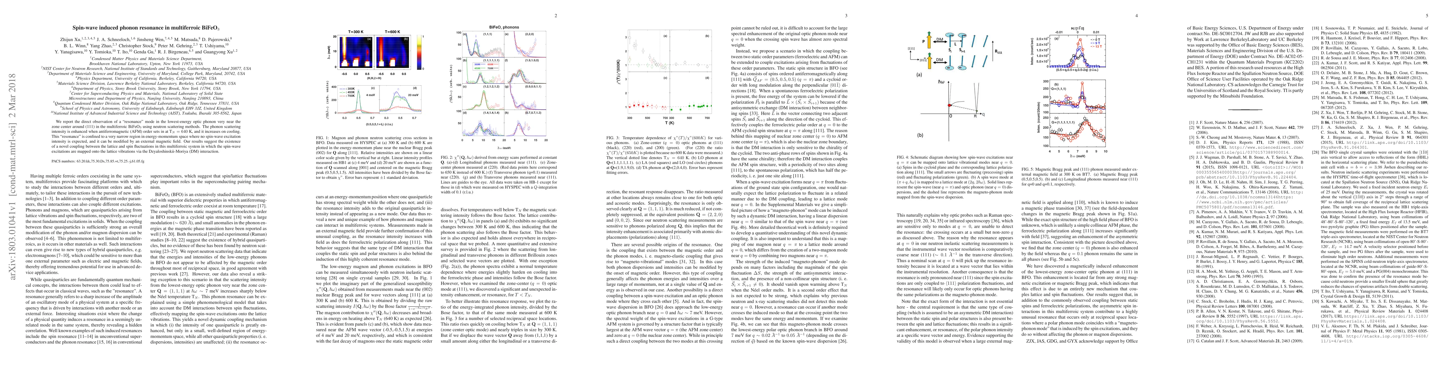 The study observes a unique "resonance" mode in the lowest-energy optic phonon of multiferroic BiFeO$_3$ using neutron scattering, showing enhanced phonon scattering intensity with antiferromagnetic order. This phonon resonance, distinct from spin-wave excitations, is influenced by magnetic fields, indicating a novel coupling between lattice and spin fluctuations via the Dzyaloshinskii-Moriya interaction.