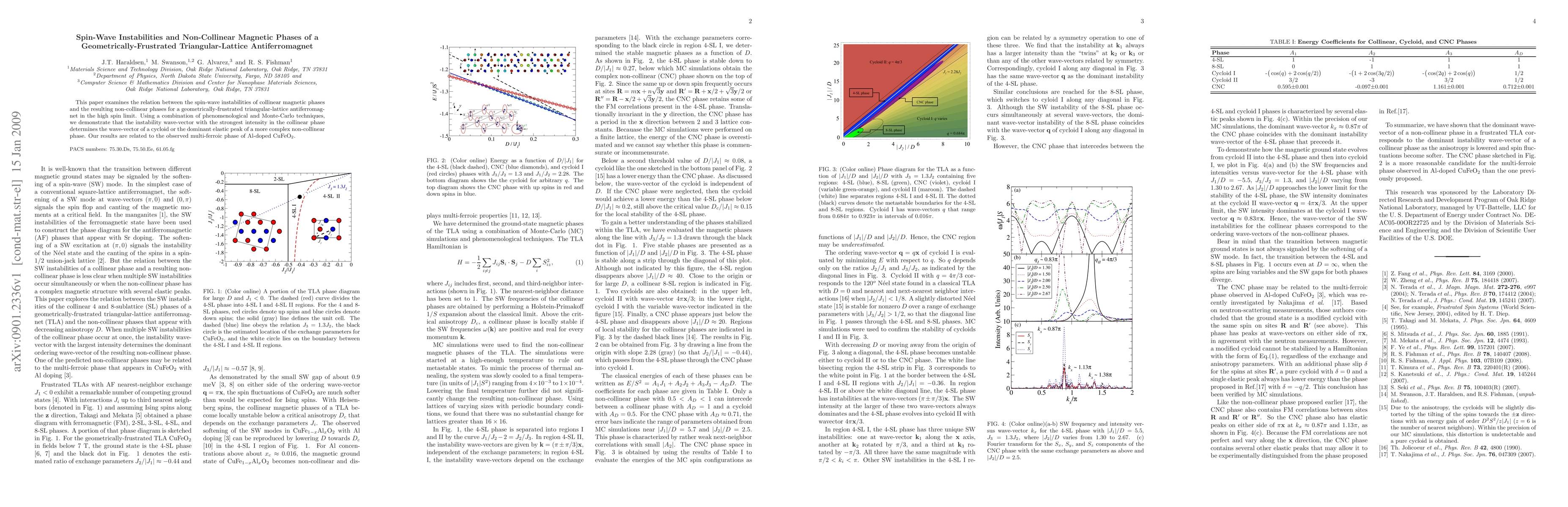This paper investigates the spin-wave instabilities in a geometrically-frustrated triangular-lattice antiferromagnet, showing that the strongest instability wave-vector in collinear phases dictates the cycloid or complex non-collinear phase formation, relevant to the multi-ferroic phase in Al-doped CuFeO$_2$.