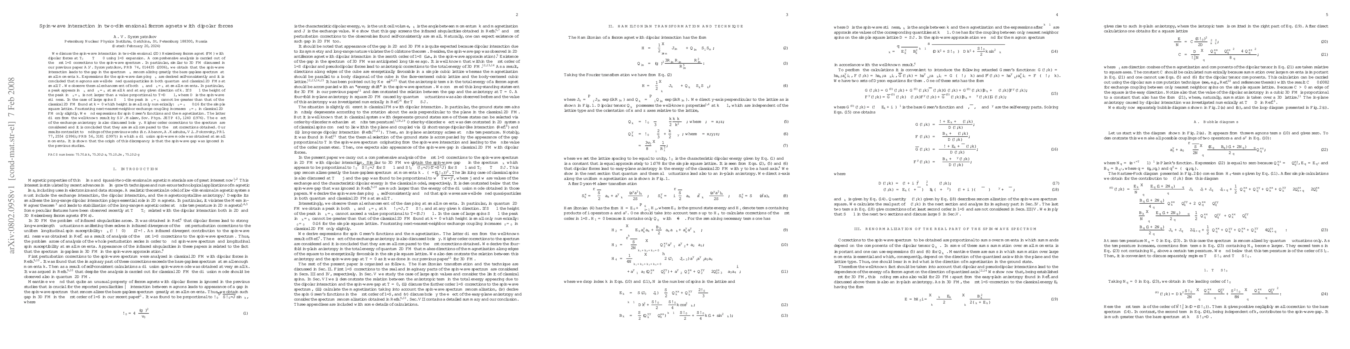 Researchers studied spin-wave interaction in two-dimensional ferromagnets with dipolar forces, finding a gap in the spectrum that renormalizes the bare gapless spectrum at small momenta, and thermal enhancement of damping and its ratio to energy.