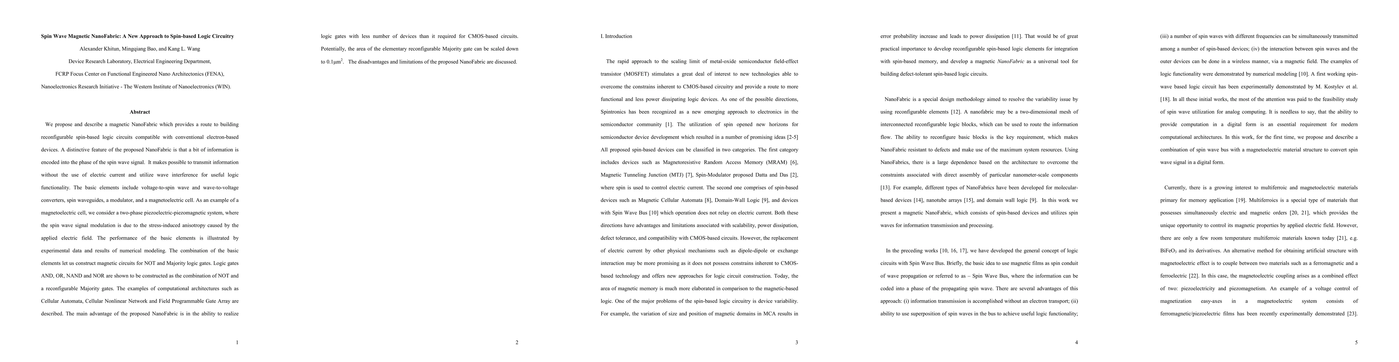 We propose and describe a magnetic NanoFabric which provides a route to building reconfigurable spin-based logic circuits compatible with conventional electron-based devices. A distinctive feature of the proposed NanoFabric is that a bit of information is encoded into the phase of the spin wave signal. It makes possible to transmit information without the use of electric current and utilize wave interference for useful logic functionality. The basic elements include voltage-to-spin wave and wave-to-voltage converters, spin waveguides, a modulator, and a magnetoelectric cell. As an example of a magnetoelectric cell, we consider a two-phase piezoelectric-piezomagnetic system, where the spin wave signal modulation is due to the stress-induced anisotropy caused by the applied electric field. The performance of the basic elements is illustrated by experimental data and results of numerical modeling. The combination of the basic elements let us construct magnetic circuits for NOT and Majority logic gates. Logic gates AND, OR, NAND and NOR are shown to be constructed as the combination of NOT and a reconfigurable Majority gates. The examples of computational architectures such as Cellular Automata, Cellular Nonlinear Network and Field Programmable Gate Array are described. The main advantage of the proposed NanoFabric is in the ability to realize logic gates with less number of devices than it required for CMOS-based circuits. Potentially, the area of the elementary reconfigurable Majority gate can be scaled down to 0.1um2. The disadvantages and limitations of the proposed NanoFabric are discussed.