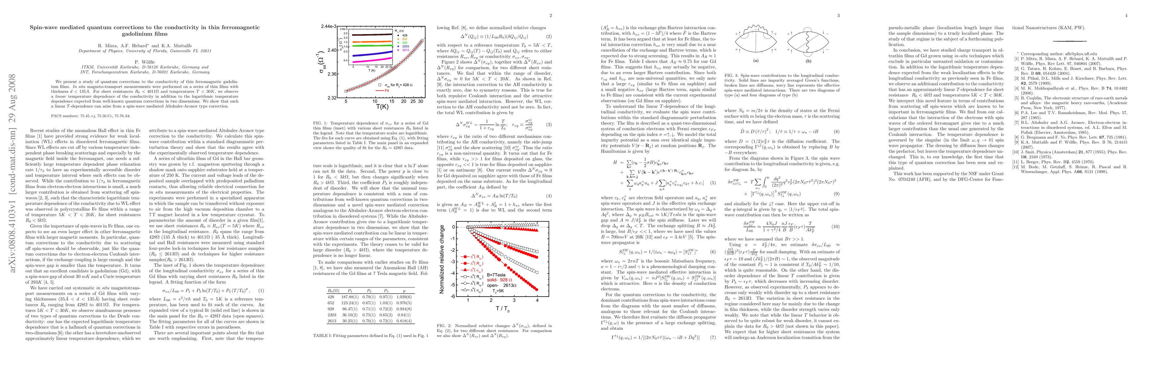 This study investigates quantum corrections to the conductivity in thin ferromagnetic gadolinium films, revealing a linear temperature dependence in addition to the expected logarithmic behavior. The observed linear T-dependence is attributed to spin-wave mediated Altshuler-Aronov type corrections.