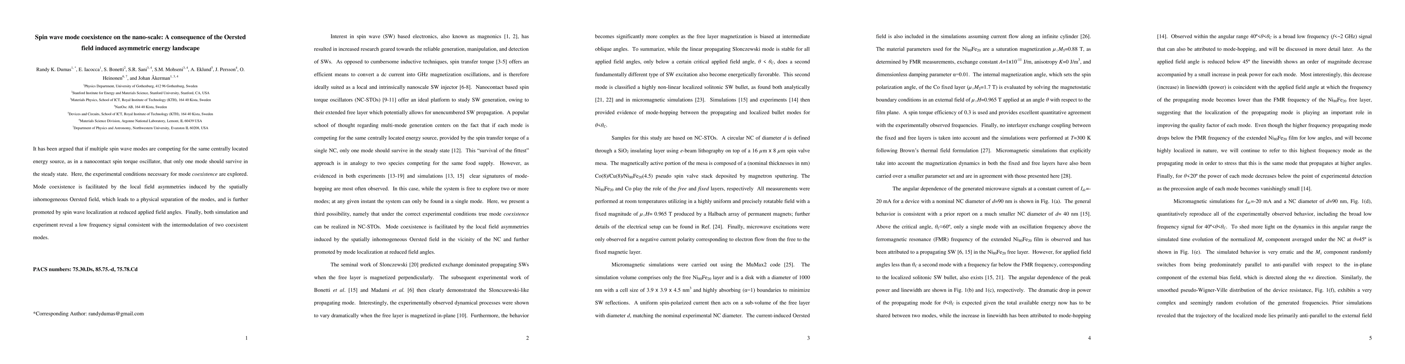 It has been argued that if multiple spin wave modes are competing for the same centrally located energy source, as in a nanocontact spin torque oscillator, that only one mode should survive in the steady state. Here, the experimental conditions necessary for mode coexistence are explored. Mode coexistence is facilitated by the local field asymmetries induced by the spatially inhomogeneous Oersted field, which leads to a physical separation of the modes, and is further promoted by spin wave localization at reduced applied field angles. Finally, both simulation and experiment reveal a low frequency signal consistent with the intermodulation of two coexistent modes.