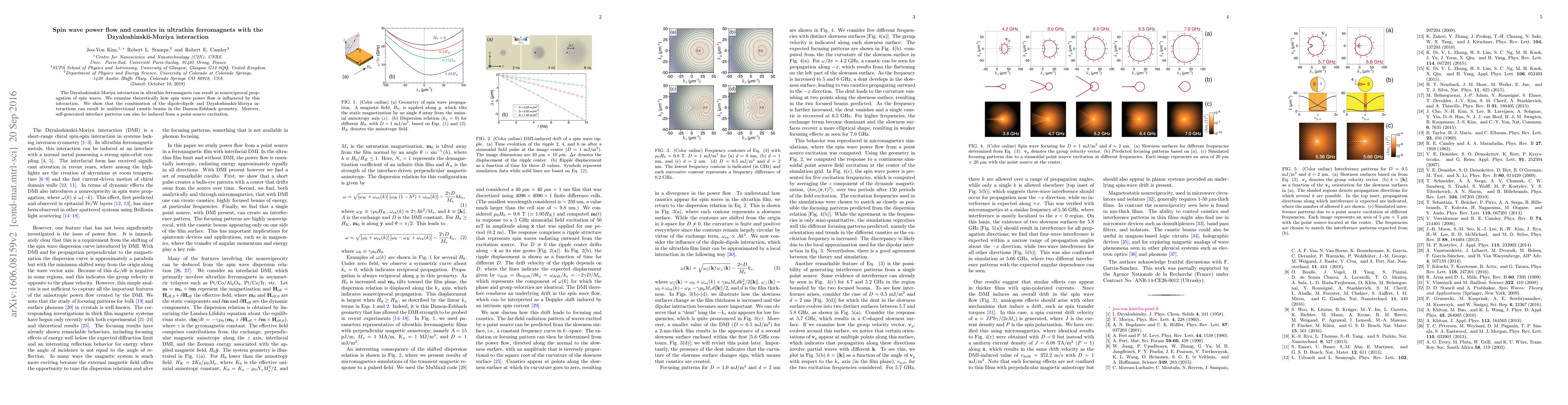 This paper theoretically investigates spin wave power flow in ultrathin ferromagnets with Dzyaloshinskii-Moriya interaction, demonstrating that it leads to unidirectional caustic beams and self-generated interface patterns in the Damon-Eshbach geometry.