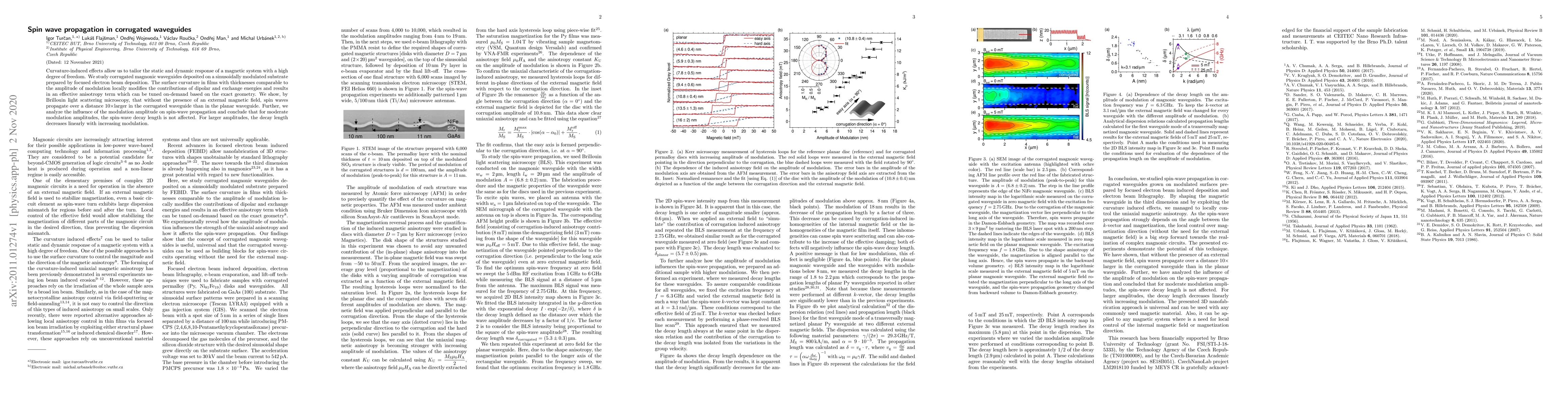 Curvature-induced effects allow us to tailor the static and dynamic response of a magnetic system with a high degree of freedom. We study corrugated magnonic waveguides deposited on a sinusoidally modulated substrate prepared by focused electron beam deposition. The surface curvature in films with thicknesses comparable to the amplitude of modulation locally modifies the contributions of dipolar and exchange energies and results in an effective anisotropy term which can be tuned on-demand based on the exact geometry. We show, by Brillouin light scattering microscopy, that without the presence of an external magnetic field, spin waves propagate over a distance 10$\times$larger in the corrugated waveguide than in the planar waveguide. Further, we analyze the influence of the modulation amplitude on spin-wave propagation and conclude that for moderate modulation amplitudes, the spin-wave decay length is not affected. For larger amplitudes, the decay length decreases linearly with increasing modulation.