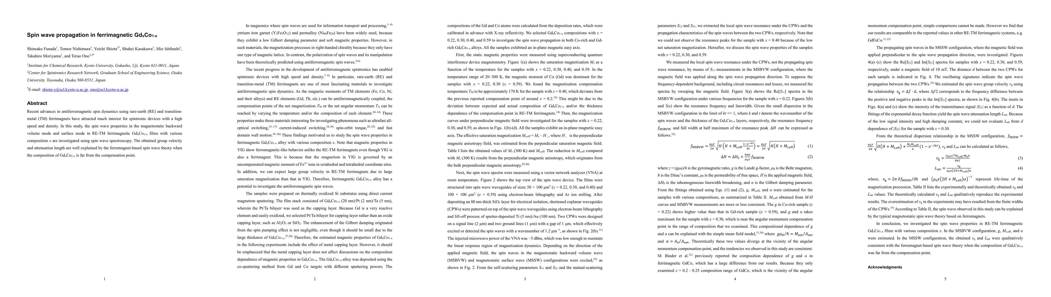 Recent advances in antiferromagnetic spin dynamics using rare-earth (RE) and transition-metal (TM) ferrimagnets have attracted much interest for spintronic devices with a high speed and density. In this study, the spin wave properties in the magnetostatic backward volume mode and surface mode in RE-TM ferrimagnetic $Gd_{x}Co_{1-x}$ films with various composition x are investigated using spin wave spectroscopy. The obtained group velocity and attenuation length are well explained by the ferromagnet-based spin wave theory when the composition of $Gd_{x}Co_{1-x}$ is far from the compensation point.
