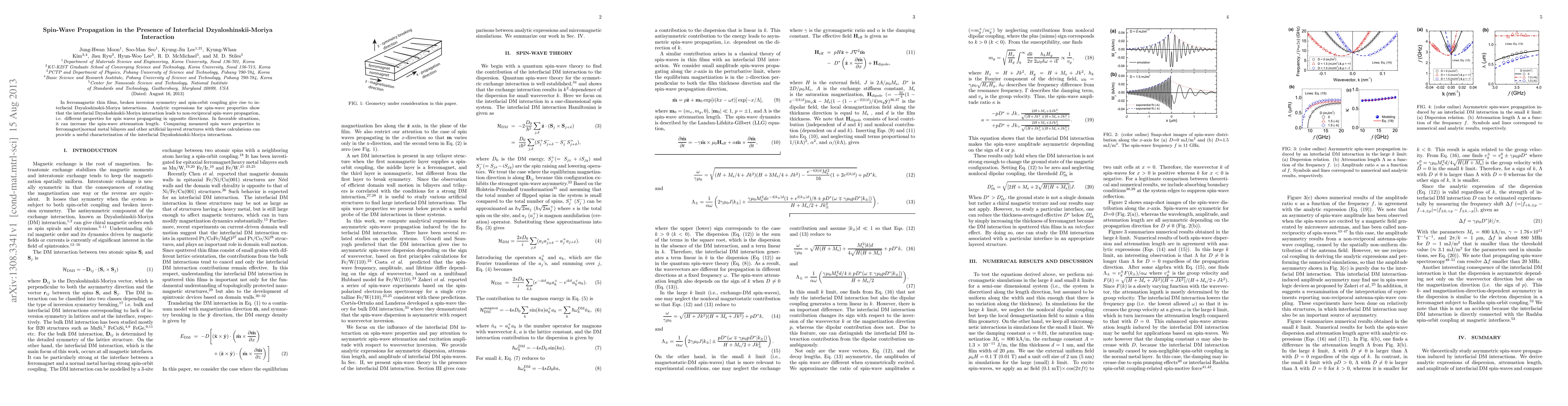 This paper investigates spin-wave propagation in ferromagnetic thin films, revealing that interfacial Dzyaloshinskii-Moriya interactions result in non-reciprocal spin-wave behavior and can enhance spin-wave attenuation length. Comparisons between theoretical calculations and experimental measurements in ferromagnet|normal metal bilayers aid in characterizing these interactions.