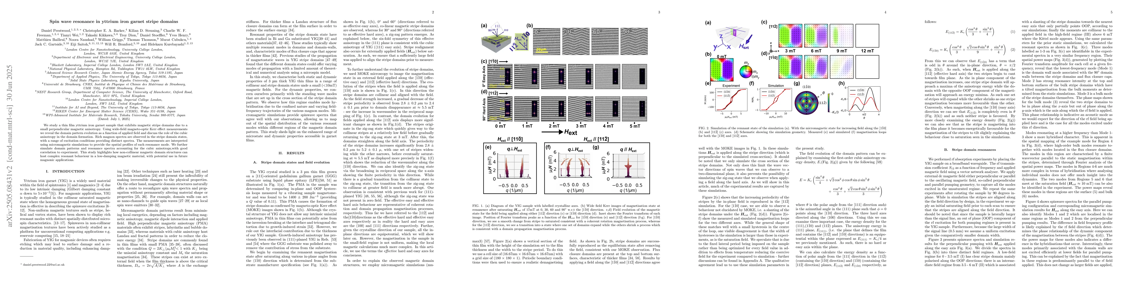 The research employs wide-field magneto-optic Kerr effect measurements to study a thin film yttrium iron garnet sample with magnetic stripe domains. Micromagnetic simulations are utilized to provide spatial profiles of resonance modes and to correlate domain patterns with resonance spectra as a function of cubic anisotropy.