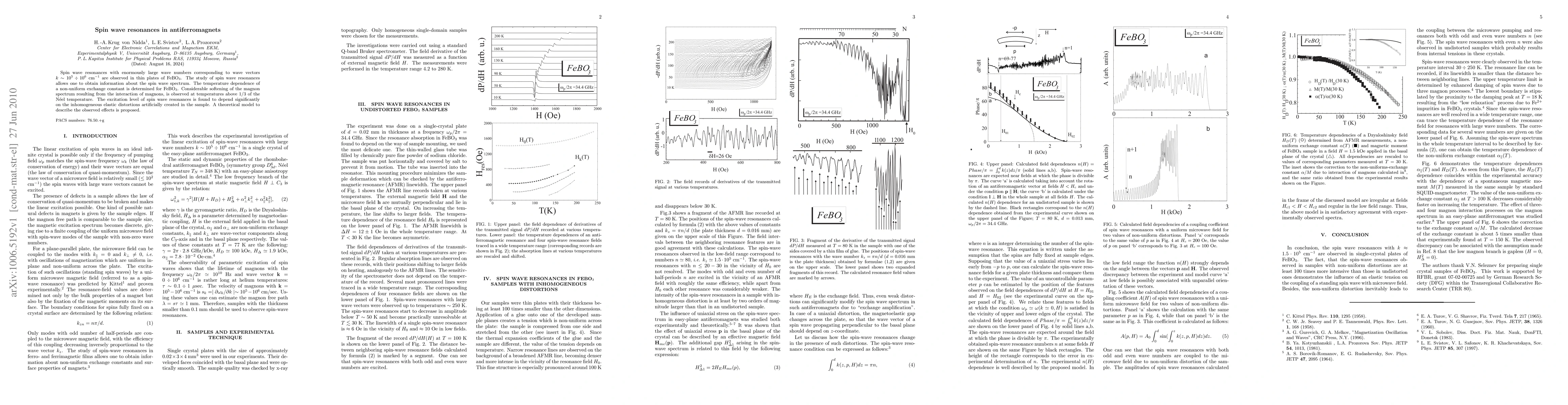 Spin wave resonances with enormously large wave numbers corresponding to wave vectors 10^5-10^6 cm^{-1} are observed in thin plates of FeBO3. The study of spin wave resonances allows one to obtain information about the spin wave spectrum. The temperature dependence of a non-uniform exchange constant is determined for FeBO3. Considerable softening of the magnon spectrum resulting from the interaction of magnons, is observed at temperatures above 1/3 of the Neel temperature. The excitation level of spin wave resonances is found to depend significantly on the inhomogeneous elastic distortions artificially created in the sample. A theoretical model to describe the observed effects is proposed.