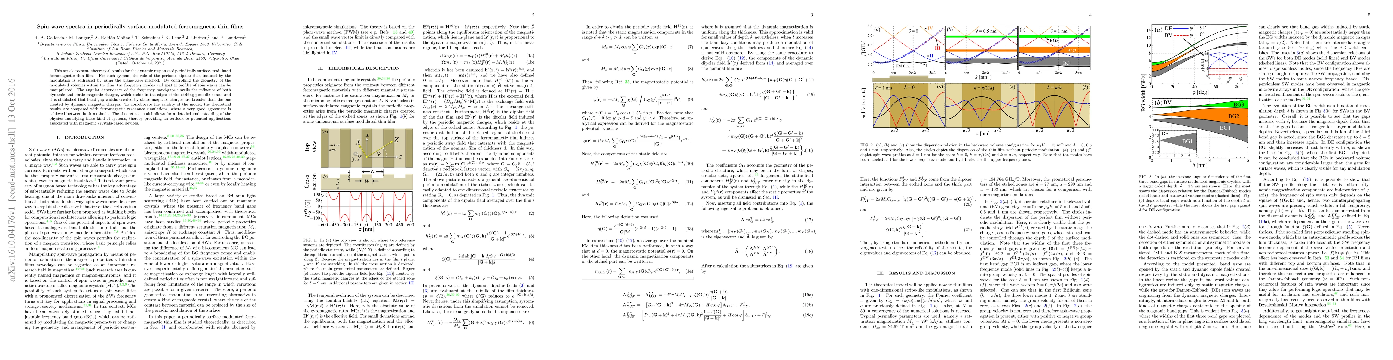This paper presents theoretical results on the dynamic response of periodically surface-modulated ferromagnetic thin films, showing how the geometry of modulations can manipulate spin-wave frequency modes and spatial profiles. The study reveals that static magnetic charges create broader band-gaps than dynamic ones, corroborated by good agreement with ferromagnetic resonance simulations.