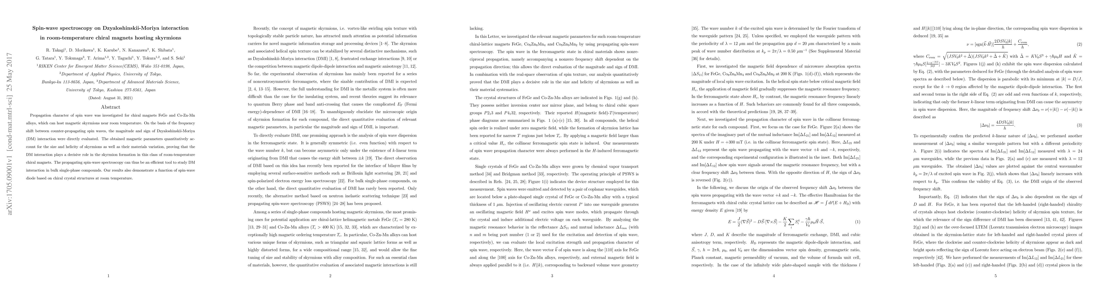 This study investigates spin-wave propagation in room-temperature chiral magnets FeGe and Co-Zn-Mn alloys, revealing the role of Dzyaloshinskii-Moriya interaction in skyrmion formation through frequency shifts. The findings suggest spin-wave spectroscopy as an effective method to analyze DM interaction and demonstrate a spin-wave diode function in chiral crystal structures.