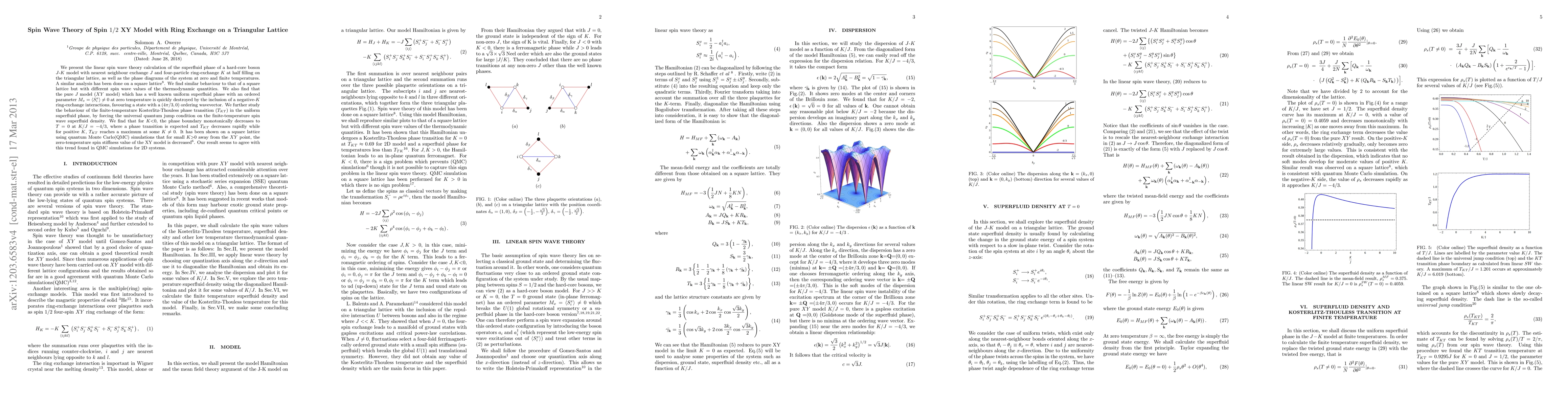 This paper investigates the spin wave theory of a spin 1/2 XY model on a triangular lattice with both nearest-neighbour and ring-exchange interactions. It finds that negative ring-exchange interactions disrupt the uniform superfluid phase, favoring a new ordering wavevector, while the Kosterlitz-Thouless phase transition temperature decreases rapidly for negative ring-exchange values.