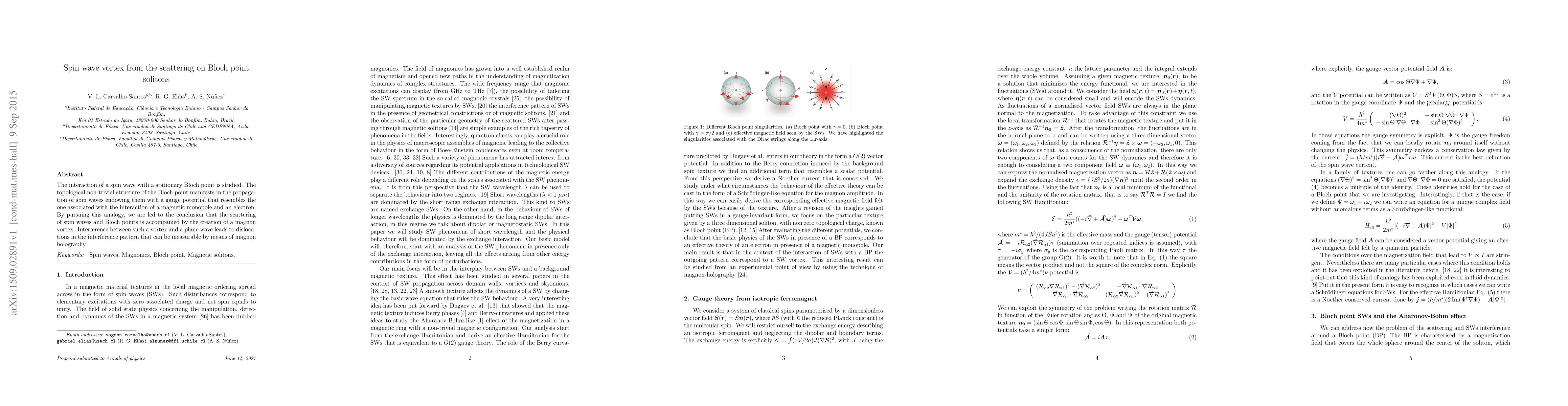 This paper investigates the interaction of spin waves with Bloch point solitons, revealing that the scattering results in the formation of a magnon vortex. Such vortices cause measurable dislocations in interference patterns, detectable via magnon holography.