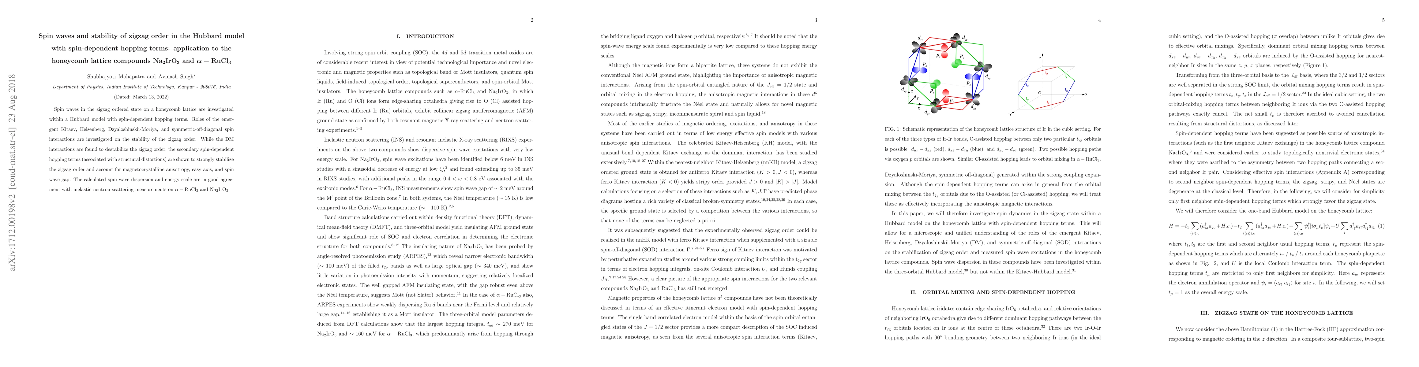 Spin waves in the zigzag ordered state on a honeycomb lattice are investigated within a Hubbard model with spin-dependent hopping terms. Roles of the emergent Kitaev, Heisenberg, Dzyaloshinskii-Moriya, and symmetric-off-diagonal spin interactions are investigated on the stability of the zigzag order. While the DM interactions are found to destabilize the zigzag order, the secondary spin-dependent hopping terms (associated with structural distortions) are shown to strongly stabilize the zigzag order and account for magnetocrystalline anisotropy, easy axis, and spin wave gap. The calculated spin wave dispersion and energy scale are in good agreement with inelastic neutron scattering measurements on $\rm \alpha - RuCl_3$ and $\rm Na_2 Ir O_3$.