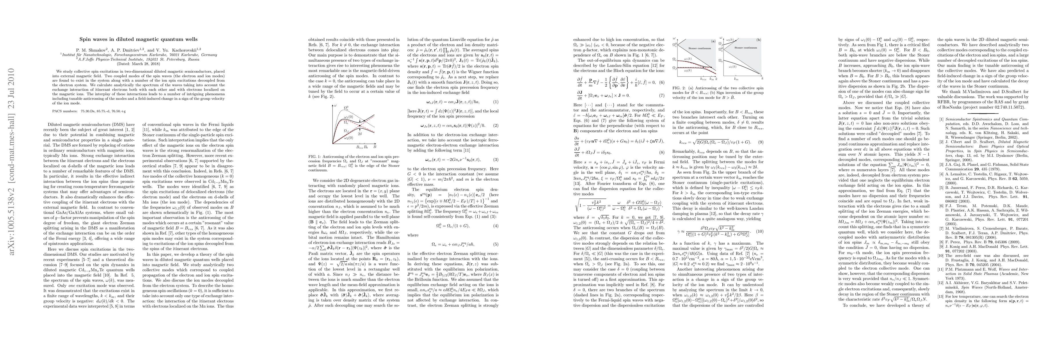 This paper investigates spin waves in diluted magnetic quantum wells under an external magnetic field, identifying two coupled spin wave modes and several decoupled ion excitations. The study analytically derives the wave spectrum, revealing phenomena such as tunable anticrossing and a field-induced reversal in the ion mode's group velocity due to electron-ion exchange interactions.