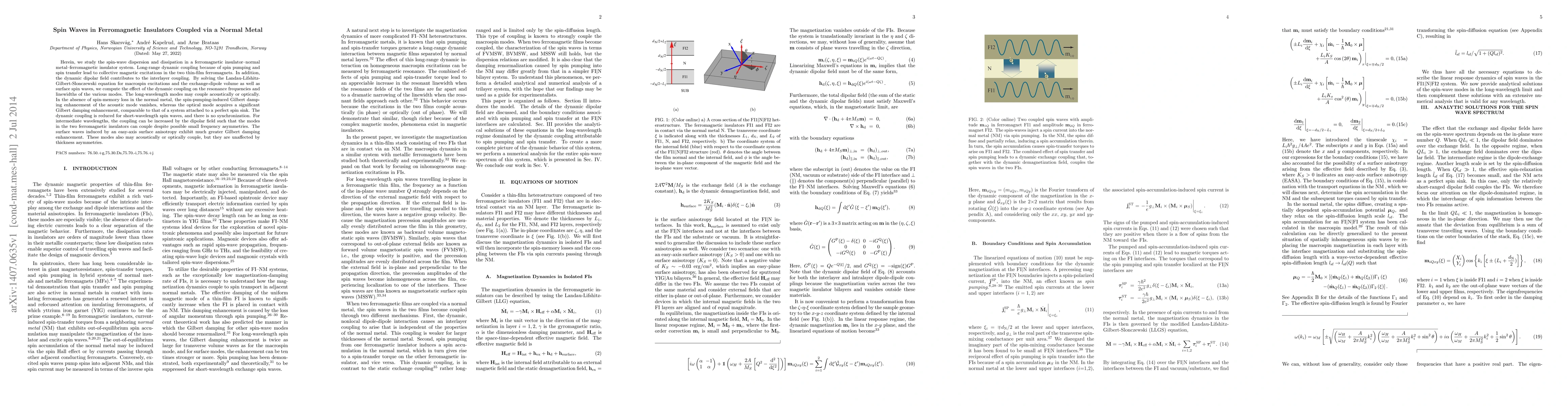 Herein, we study the spin-wave dispersion and dissipation in a ferromagnetic insulator--normal metal--ferromagnetic insulator system. Long-range dynamic coupling because of spin pumping and spin transfer lead to collective magnetic excitations in the two thin-film ferromagnets. In addition, the dynamic dipolar field contributes to the interlayer coupling. By solving the Landau-Lifshitz-Gilbert-Slonczewski equation for macrospin excitations and the exchange-dipole volume as well as surface spin waves, we compute the effect of the dynamic coupling on the resonance frequencies and linewidths of the various modes. The long-wavelength modes may couple acoustically or optically. In the absence of spin-memory loss in the normal metal, the spin-pumping-induced Gilbert damping enhancement of the acoustic mode vanishes, whereas the optical mode acquires a significant Gilbert damping enhancement, comparable to that of a system attached to a perfect spin sink. The dynamic coupling is reduced for short-wavelength spin waves, and there is no synchronization. For intermediate wavelengths, the coupling can be increased by the dipolar field such that the modes in the two ferromagnetic insulators can couple despite possible small frequency asymmetries. The surface waves induced by an easy-axis surface anisotropy exhibit much greater Gilbert damping enhancement. These modes also may acoustically or optically couple, but they are unaffected by thickness asymmetries.
