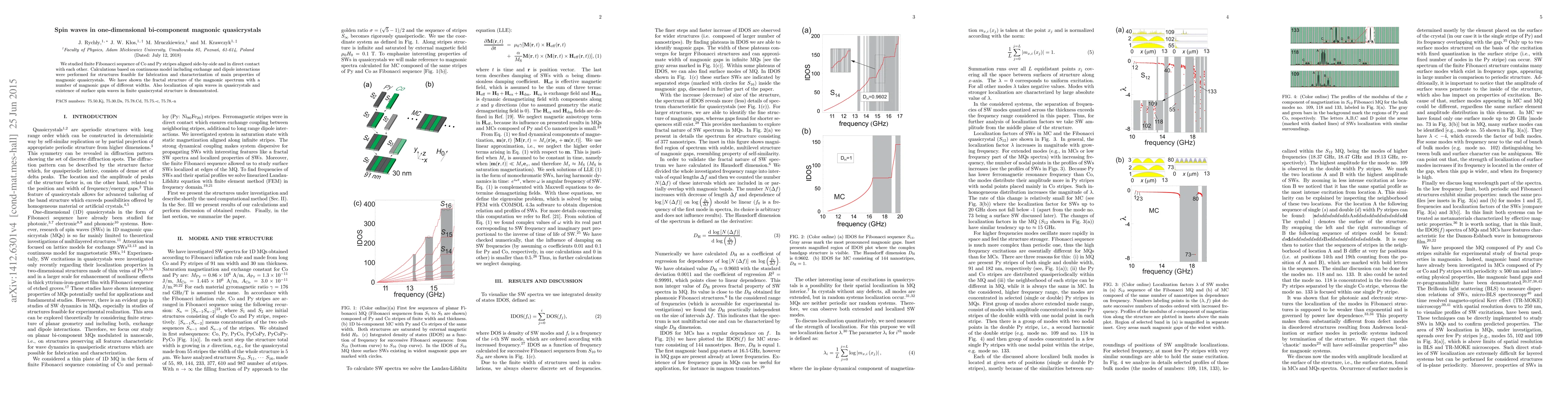 We studied finite Fibonacci sequence of Co and Py stripes aligned side-by-side and in direct contact with each other. Calculations based on continuous model including exchange and dipole interactions were performed for structures feasible for fabrication and characterization of main properties of magnonic quasicrystals. We have shown the fractal structure of the magnonic spectrum with a number of magnonics gaps of different width. Also localization of spin waves in quasicrystals and existence of surface spin waves in finite quaiscrystal structure is demonstrated.