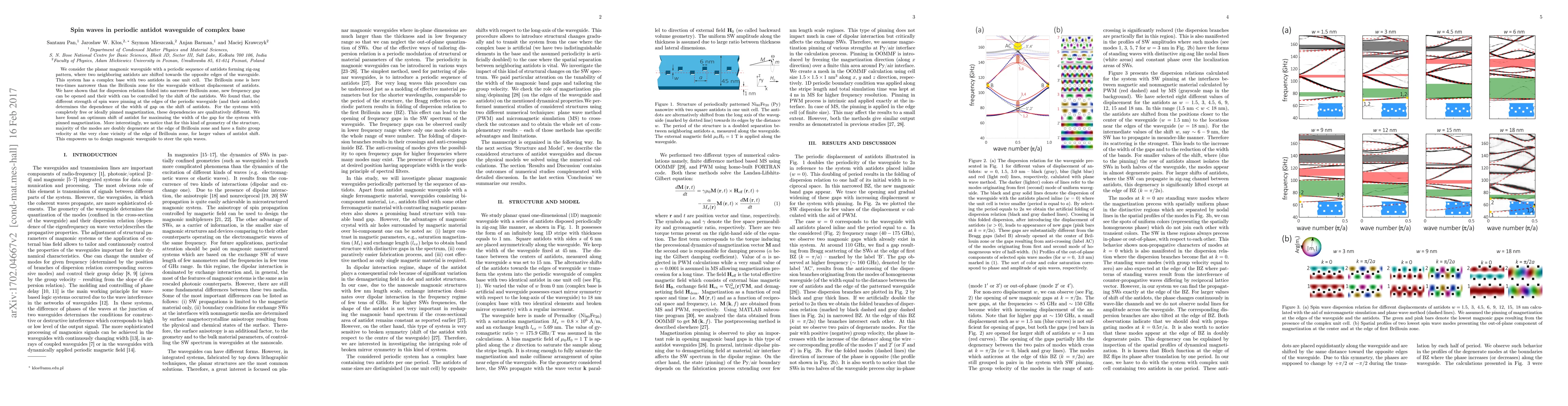 We consider the planar magnonic waveguide with a periodic sequence of antidots forming zig-zag pattern, where two neighboring antidots are shifted towards the opposite edges of the waveguide. This system has a complex base with two antidots in one unit cell. The Brillouin zone is here two-times narrower than the Brillouin zone for the waveguide without displacement of antidots. We have shown that for dispersion relation folded into narrower Brillouin zone, new frequency gap can be opened and their width can be controlled by the shift of the antidots. We found that, the different strength of spin wave pinning at the edges of the periodic waveguide (and their antidots)determines the dependence of the width of gap on the shift of antidots. For the systems with completely free or ideally pinned magnetization, these dependencies are qualitatively different. We have found an optimum shift of antidot for maximzing the width of the gap for the system with pinned magnetization. More interestingly, we notice that for this kind of geometry of the structure, majority of the modes are doubly degenerate at the edge of Brillouin zone and have a finite group velocity at the very close vicinity of the edge of Brillouin zone, for larger values of antidot shift. This empowers us to design magnonic waveguide to steer the spin waves.