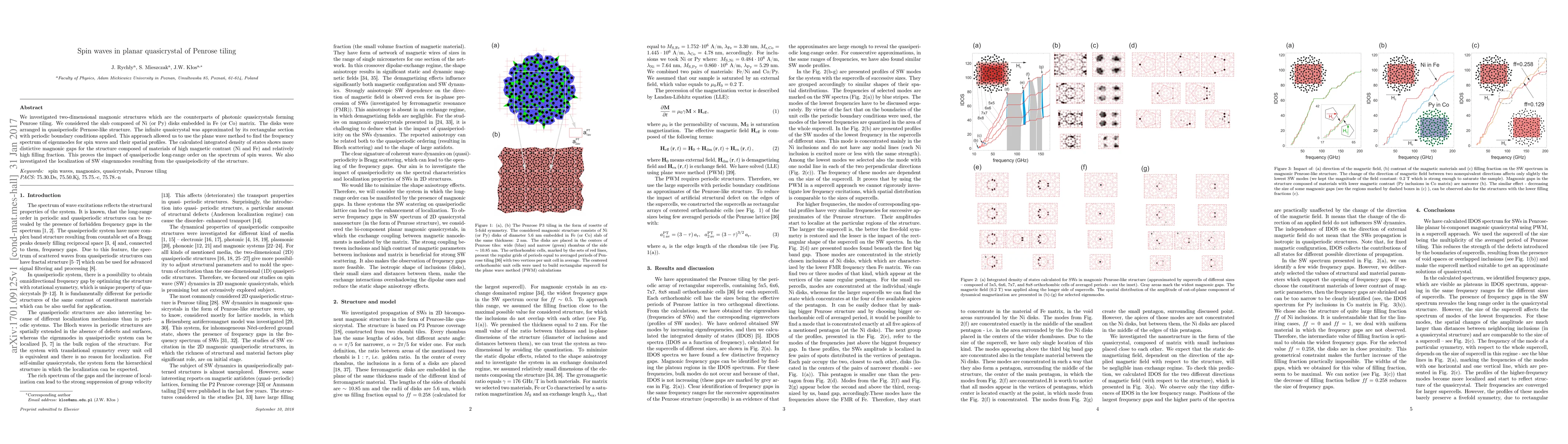 We investigated two-dimensional magnonic structures which are the counterparts of photonic quasicrystals forming Penrose tiling. We considered the slab composed of Ni (or Py) disks embedded in Fe (or Co) matrix. The disks were arranged in quasiperiodic Pernose-like structure. The infinite quasicrystal was approximated by its rectangular section with periodic boundary conditions applied. This approach allowed us to use the plane wave method to find the frequency spectrum of eigenmodes for spin waves and their spatial profiles. The calculated integrated density of states shows more distictive magnonic gaps for the structure composed of materials of high magnetic contrast (Ni and Fe) and relatively high filling fraction. This proves the impact of quasiperiodic long-range order on the spectrum of spin waves. We also investigated the localization of SW eingenmodes resulting from the quasipeiodicity of the structure.
