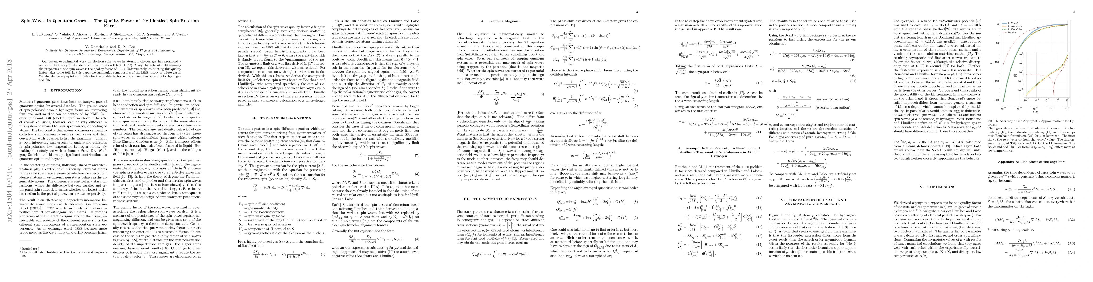 This paper revisits the theory of the Identical Spin Rotation Effect (ISRE) in quantum gases, focusing on electron spin waves in atomic hydrogen gas. The authors derive asymptotic formulae for the quality factor of ISRE and assess their accuracy for hydrogen and helium-3.