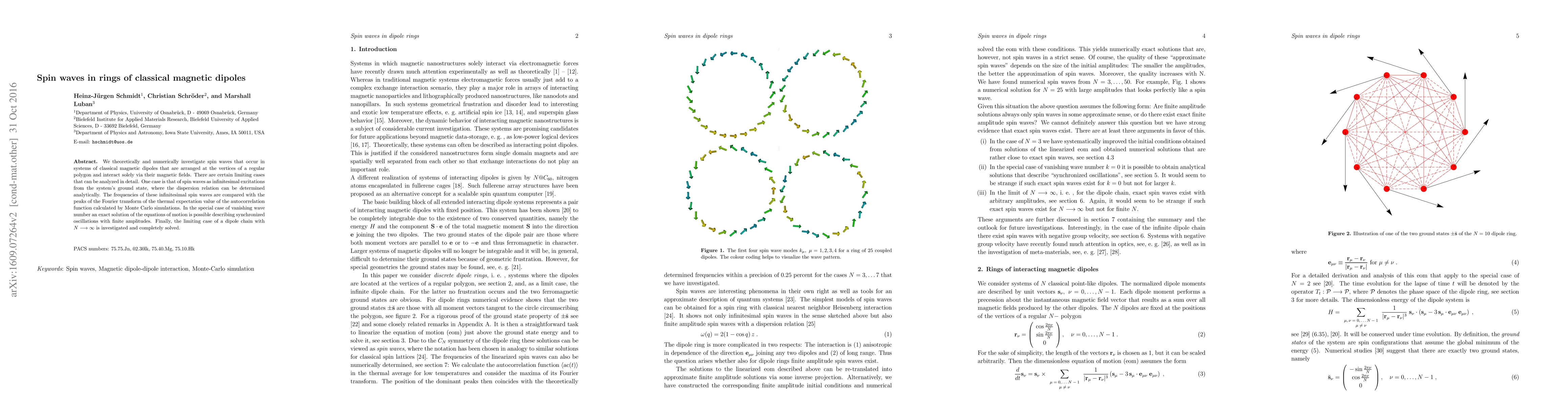 We theoretically and numerically investigate spin waves that occur in systems of classical magnetic dipoles that are arranged at the vertices of a regular polygon and interact solely via their magnetic fields. There are certain limiting cases that can be analyzed in detail. One case is that of spin waves as infinitesimal excitations from the system's ground state, where the dispersion relation can be determined analytically. The frequencies of these infinitesimal spin waves are compared with the peaks of the Fourier transform of the thermal expectation value of the autocorrelation function calculated by Monte Carlo simulations. In the special case of vanishing wave number an exact solution of the equations of motion is possible describing synchronized oscillations with finite amplitudes. Finally, the limiting case of a dipole chain with $N\longrightarrow \infty$ is investigated and completely solved.