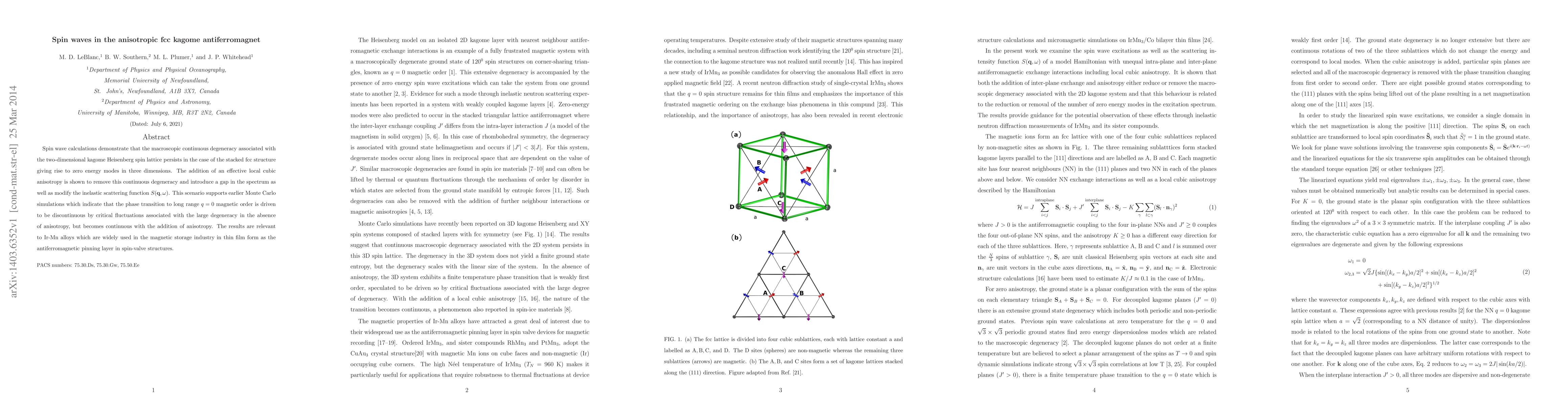 Spin wave calculations demonstrate that the macroscopic continuous degeneracy associated with the two-dimensional kagome Heisenberg spin lattice persists in the case of the stacked fcc structure giving rise to zero energy modes in three dimensions. The addition of an effective local cubic anisotropy is shown to remove this continuous degeneracy and introduce a gap in the spectrum as well as modify the inelastic scattering function $S({\bf q},\omega)$. This scenario supports earlier Monte Carlo simulations which indicate that the phase transition to long range $q=0$ magnetic order is driven to be discontinuous by critical fluctuations associated with the large degeneracy in the absence of anisotropy, but becomes continuous with the addition of anisotropy. The results are relevant to Ir-Mn alloys which are widely used in the magnetic storage industry in thin film form as the antiferromagnetic pinning layer in spin-valve structures.
