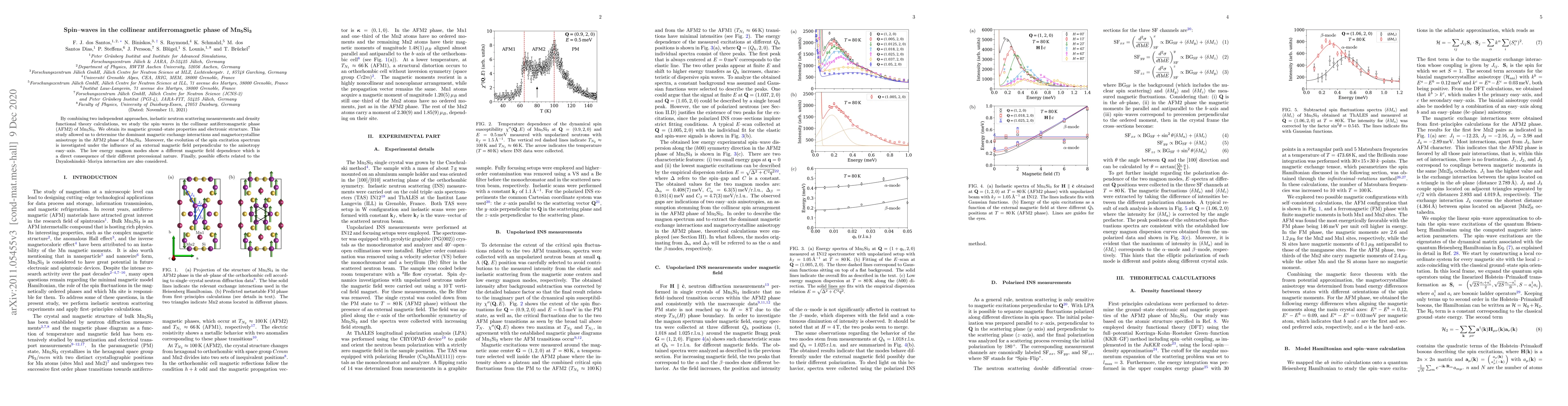 By combining two independent approaches, inelastic neutron scattering measurements and density functional theory calculations, we study the spin-waves in the high-temperature collinear antiferromagnetic phase (AFM2) of Mn$_5$Si$_3$. We obtain its magnetic ground-state properties and electronic structure. This study allowed us to determine the dominant magnetic exchange interactions and magnetocrystalline anisotropy in the AFM2 phase of Mn$_5$Si$_3$. Moreover, the evolution of the spin excitation spectrum is investigated under the influence of an external magnetic field perpendicular to the anisotropy easy-axis. The low energy magnon modes show a different magnetic field dependence which is a direct consequence of their different precessional nature. Finally, possible effects related to the Dzyaloshinskii-Moriya interaction are also considered.
