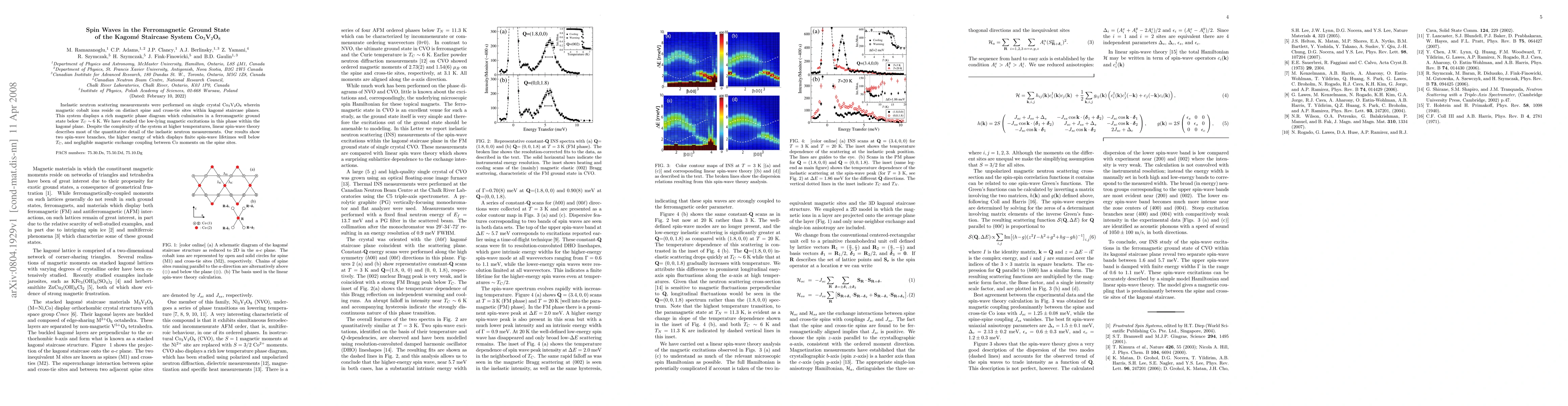 Inelastic neutron scattering measurements were performed on single crystal Co3V2O8 wherein magnetic cobalt ions reside on distinct spine and cross-tie sites within kagome staircase planes. This system displays a rich magnetic phase diagram which culminates in a ferromagnetic ground state below Tc~6 K. We have studied the low-lying magnetic excitations in this phase within the kagome plane. Despite the complexity of the system at higher temperatures, linear spin-wave theory describes most of the quantitative detail of the inelastic neutron measurements. Our results show two spin-wave branches, the higher energy of which displays finite spin-wave lifetimes well below Tc, and negligible magnetic exchange coupling between Co moments on the spine sites.