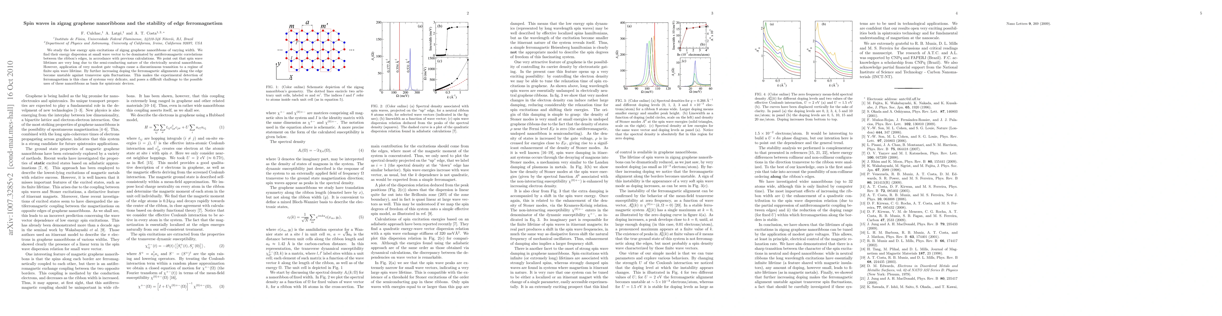 This paper investigates spin waves in zigzag graphene nanoribbons, revealing long spin wave lifetimes due to the semiconducting nature. However, gate voltages induce a transition to finite lifetimes, destabilizing edge ferromagnetism and complicating the use of these nanoribbons in spintronic devices.