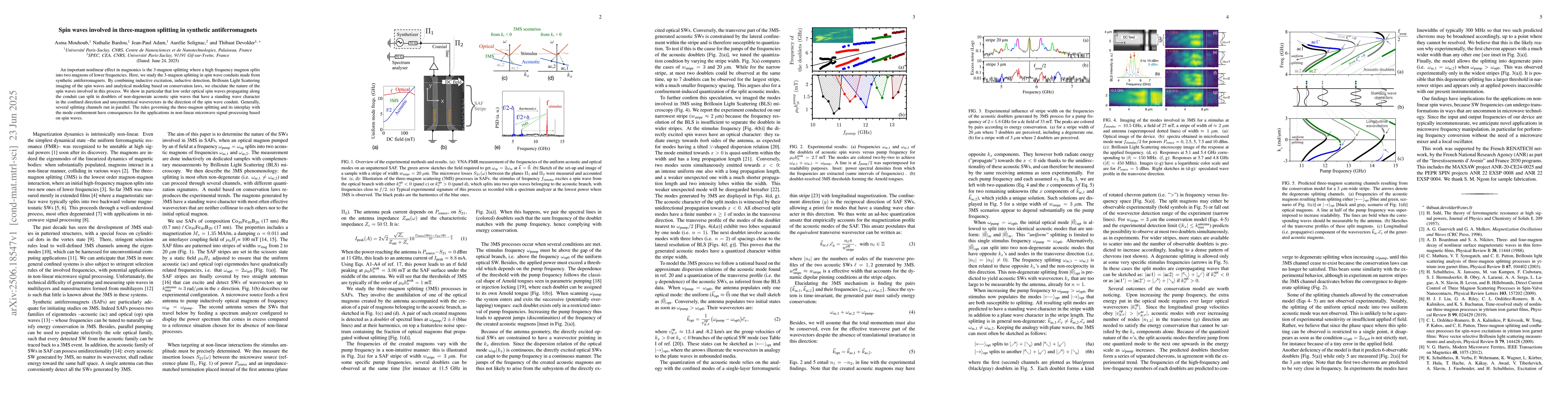 An important nonlinear effect in magnonics is the 3-magnon splitting where a high frequency magnon splits into two magnons of lower frequencies. Here, we study the 3-magnon splitting in spin wave conduits made from synthetic antiferromagnets. By combining inductive excitation, inductive detection, Brillouin Light Scattering imaging of the spin waves and analytical modeling based on conservation laws, we elucidate the nature of the spin waves involved in this process. We show in particular that low order optical spin waves propagating along the conduit can split in doublets of non-degenerate acoustic spin waves that have a standing wave character in the confined direction and unsymmetrical wavevectors in the direction of the spin wave conduit. Generally, several splitting channels run in parallel. The rules governing the three-magnon splitting and its interplay with the mode confinement have consequences for the applications in non-linear microwave signal processing based on spin waves.