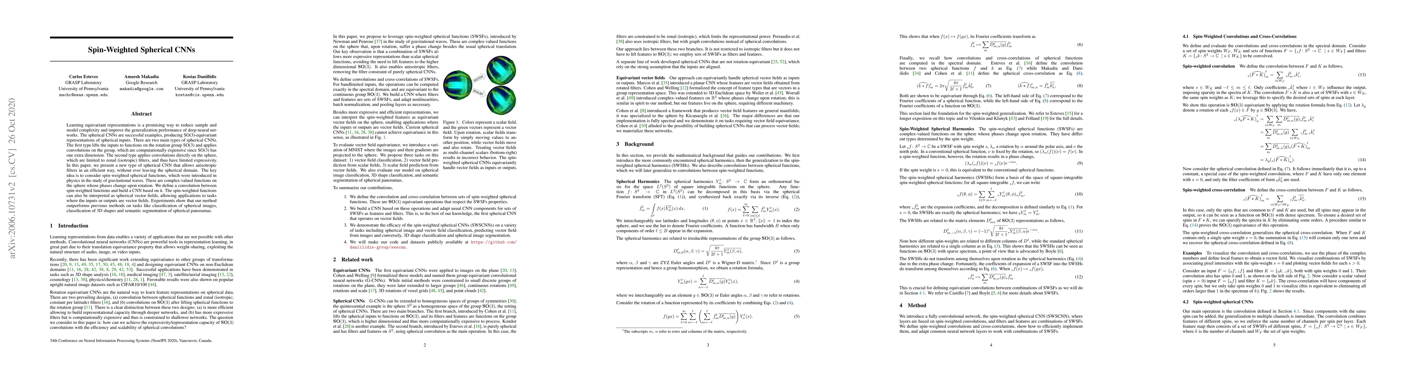 This paper introduces a new type of spherical CNN that utilizes spin-weighted spherical functions to enable anisotropic filters efficiently. The proposed method outperforms previous methods in tasks such as classification of spherical images, 3D shapes, and semantic segmentation of spherical panoramas.
