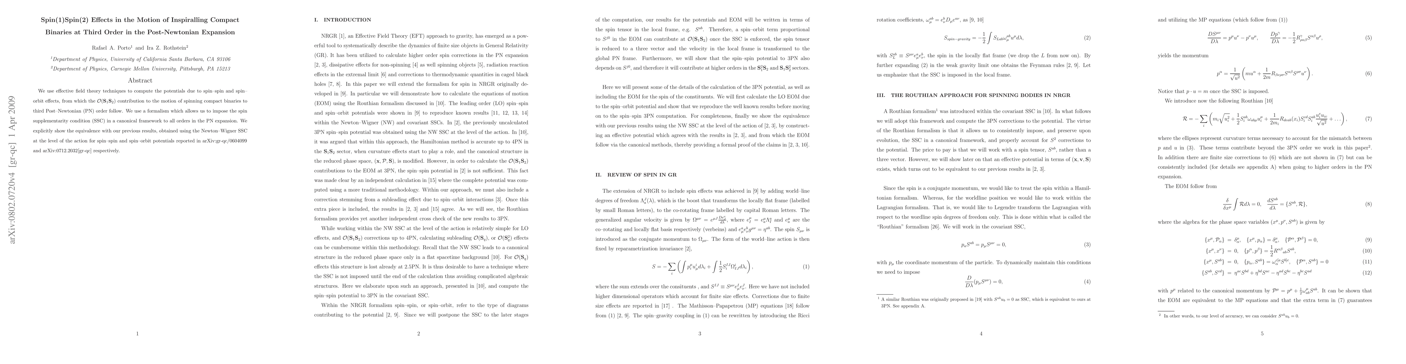 This paper employs effective field theory to calculate spin-spin and spin-orbit potentials, determining the spin(1)spin(2) effects on the motion of inspiralling compact binaries up to third Post-Newtonian order. It uses a formalism that incorporates the spin supplementarity condition canonically, confirming consistency with prior results from the Newton-Wigner SSC.