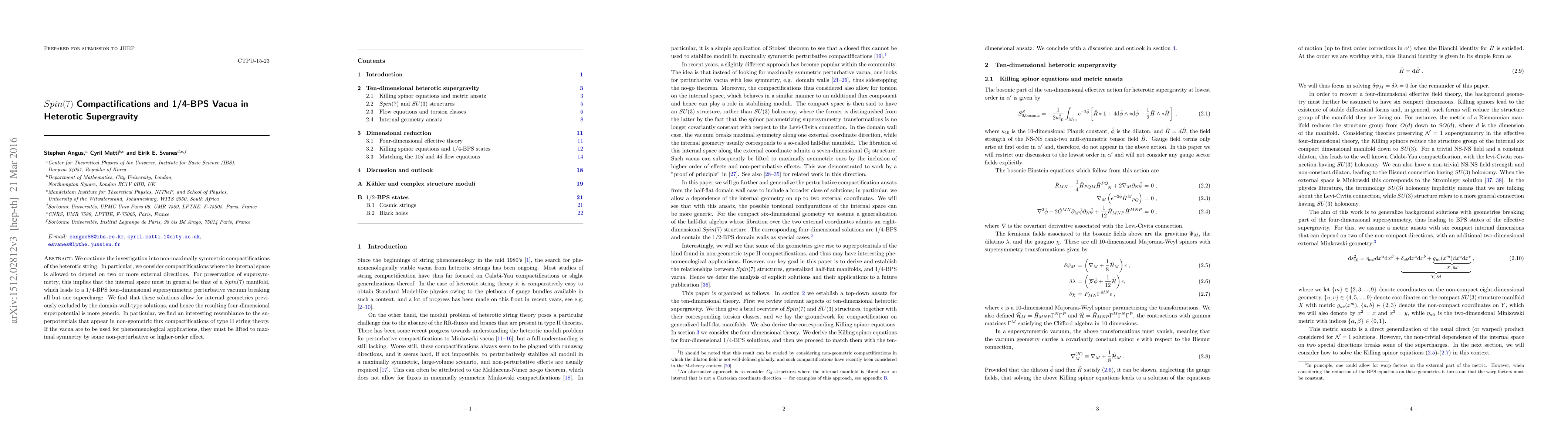 We continue the investigation into non-maximally symmetric compactifications of the heterotic string. In particular, we consider compactifications where the internal space is allowed to depend on two or more external directions. For preservation of supersymmetry, this implies that the internal space must in general be that of a $Spin(7)$ manifold, which leads to a $1/4$-BPS four-dimensional supersymmetric perturbative vacuum breaking all but one supercharge. We find that these solutions allow for internal geometries previously excluded by the domain-wall-type solutions, and hence the resulting four-dimensional superpotential is more generic. In particular, we find an interesting resemblance to the superpotentials that appear in non-geometric flux compactifications of type II string theory. If the vacua are to be used for phenomenological applications, they must be lifted to maximal symmetry by some non-perturbative or higher-order effect.