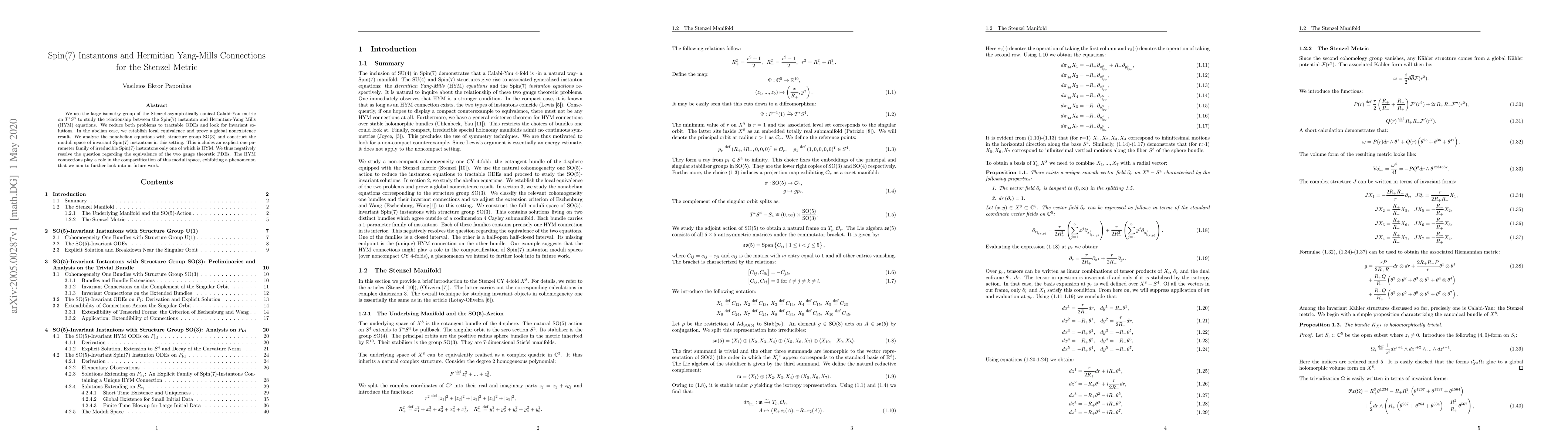 This paper explores the relationship between Spin(7) instantons and Hermitian-Yang Mills (HYM) connections in the context of the Stenzel metric, demonstrating local equivalence in the abelian case but proving global nonexistence. It constructs the moduli space of invariant Spin(7) instantons and finds only one HYM instanton, resolving the equivalence question negatively.
