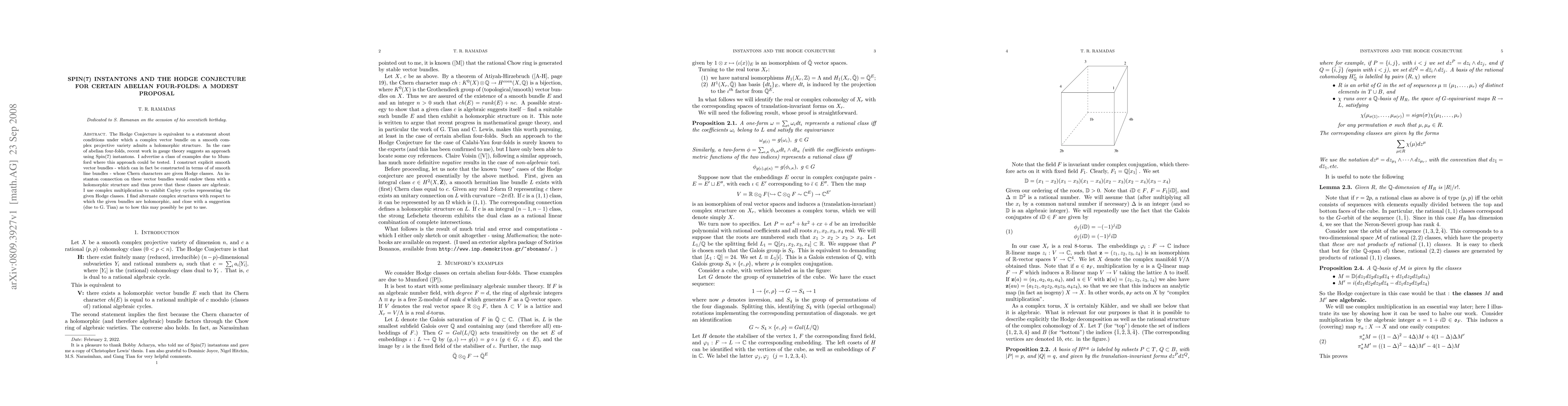 The Hodge Conjecture is equivalent to a statement about conditions under which a complex vector bundle on a smooth complex projective variety admits a holomorphic structure. I advertise a class of abelian four-folds due to Mumford where this approach could be tested. I construct explicit smooth vector bundles - which can in fact be constructed in terms of of smooth line bundles - whose Chern characters are given Hodge classes. An instanton connection on these vector bundles would endow them with a holomorphic structure and thus prove that these classes are algebraic. I use complex multiplication to exhibit Cayley cycles representing the given Hodge classes. I find alternate complex structures with respect to which the given bundles are holomorphic, and close with a suggestion (due to G. Tian) as to how this may possibly be put to use.