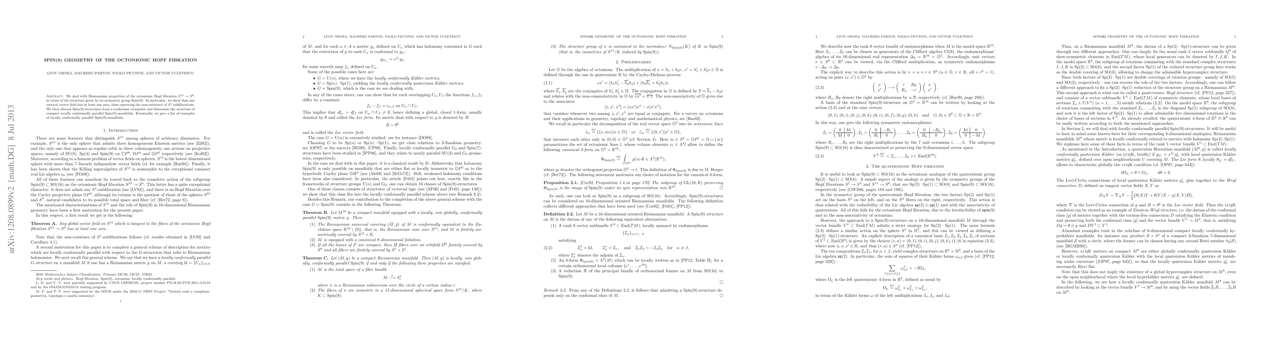 Researchers investigate the geometry of the octonionic Hopf fibration using Spin(9) properties, proving the non-existence of certain subfibrations and exploring locally conformally parallel manifolds.