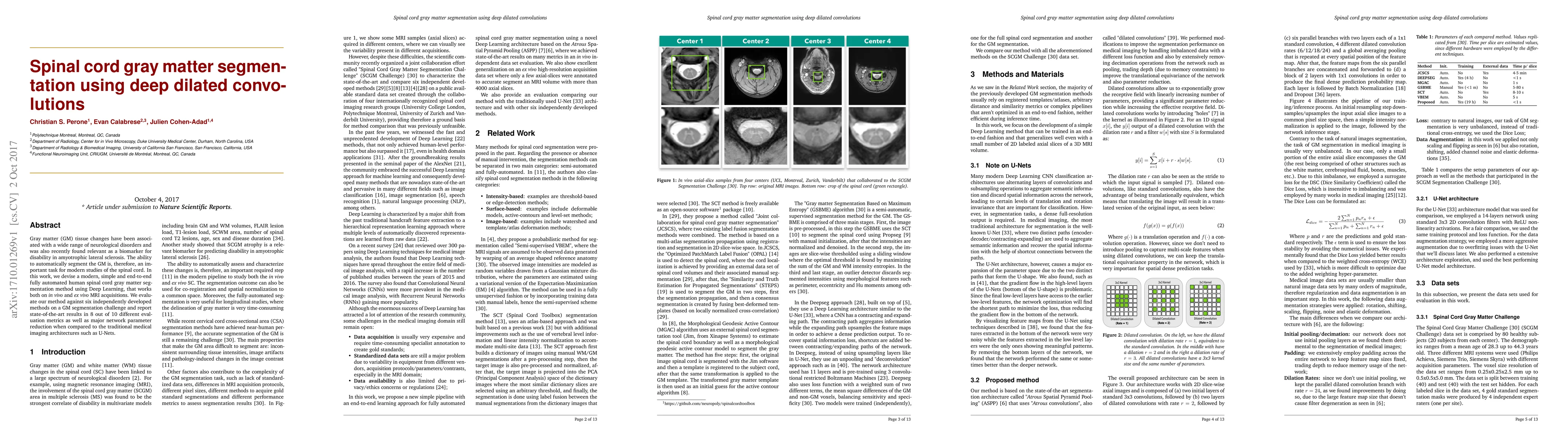 This paper presents a novel deep learning method for automatic spinal cord gray matter segmentation using deep dilated convolutions, achieving state-of-the-art results in multiple evaluation metrics and demonstrating significant parameter reduction compared to traditional methods.