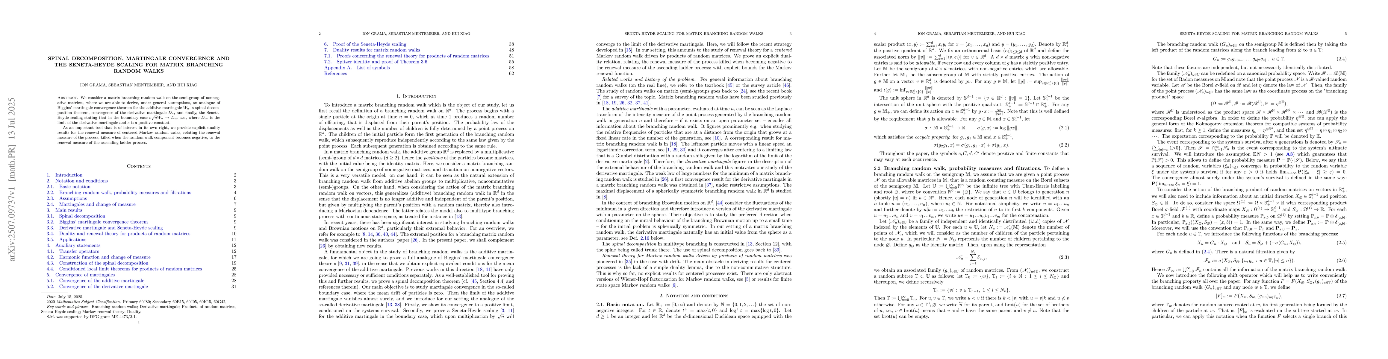 We consider a matrix branching random walk on the semi-group of nonnegative matrices, where we are able to derive, under general assumptions, an analogue of Biggins' martingale convergence theorem for the additive martingale $W_n$, a spinal decomposition theorem, convergence of the derivative martingale $D_n$, and finally, the Seneta-Heyde scaling stating that in the boundary case $c \sqrt{n} W_n \to D_\infty$ a.s., where $D_\infty$ is the limit of the derivative martingale and $c$ is a positive constant. As an important tool that is of interest in its own right, we provide explicit duality results for the renewal measure of centered Markov random walks, relating the renewal measure of the process, killed when the random walk component becomes negative, to the renewal measure of the ascending ladder process.