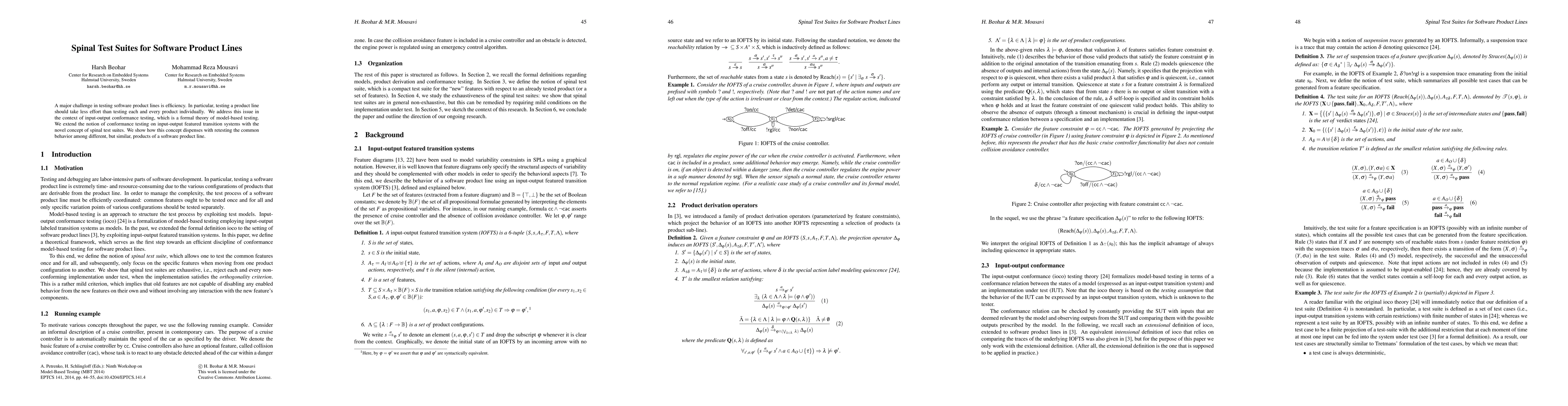 This paper introduces spinal test suites to improve the efficiency of testing software product lines by reducing the need to retest common behaviors across similar products, leveraging input-output conformance testing within model-based testing frameworks.