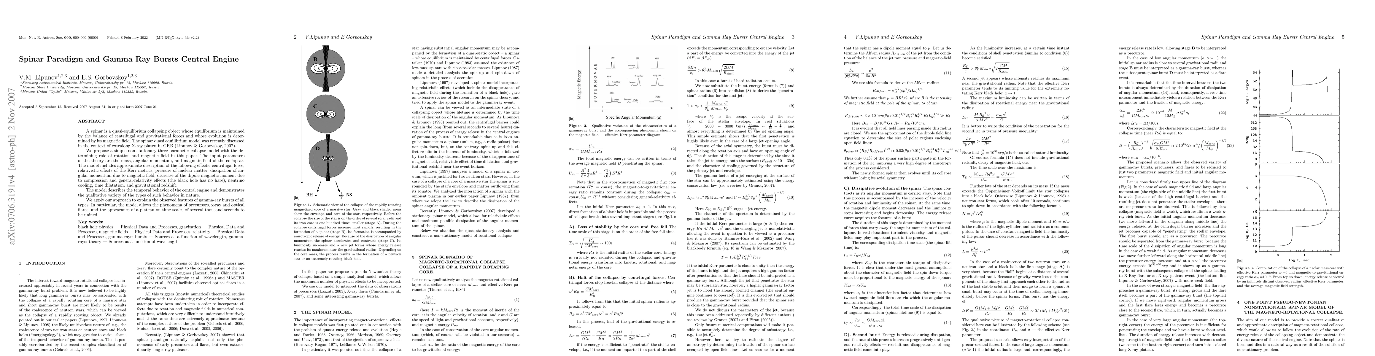 A spinar is a quasi-equilibrium collapsing object whose equilibrium is maintained by the balance of centrifugal and gravitational forces and whose evolution is determined by its magnetic field. The spinar quasi equilibrium model recently discussed as the course for extralong X-ray plateu in GRB (Lipunov & Gorbovskoy, 2007). We propose a simple non stationary three-parameter collapse model with the determining role of rotation and magnetic field in this paper. The input parameters of the theory are the mass, angular momentum, and magnetic field of the collapsar. The model includes approximate description of the following effects: centrifugal force, relativistic effects of the Kerr metrics, pressure of nuclear matter, dissipation of angular momentum due to magnetic field, decrease of the dipole magnetic moment due to compression and general-relativity effects (the black hole has no hare), neutrino cooling, time dilatation, and gravitational redshift. The model describes the temporal behavior of the central engine and demonstrates the qualitative variety of the types of such behavior in nature. We apply our approach to explain the observed features of gamma-ray bursts of all types. In particular, the model allows the phenomena of precursors, x-ray and optical bursts, and the appearance of a plateau on time scales of several thousand seconds to be unified.